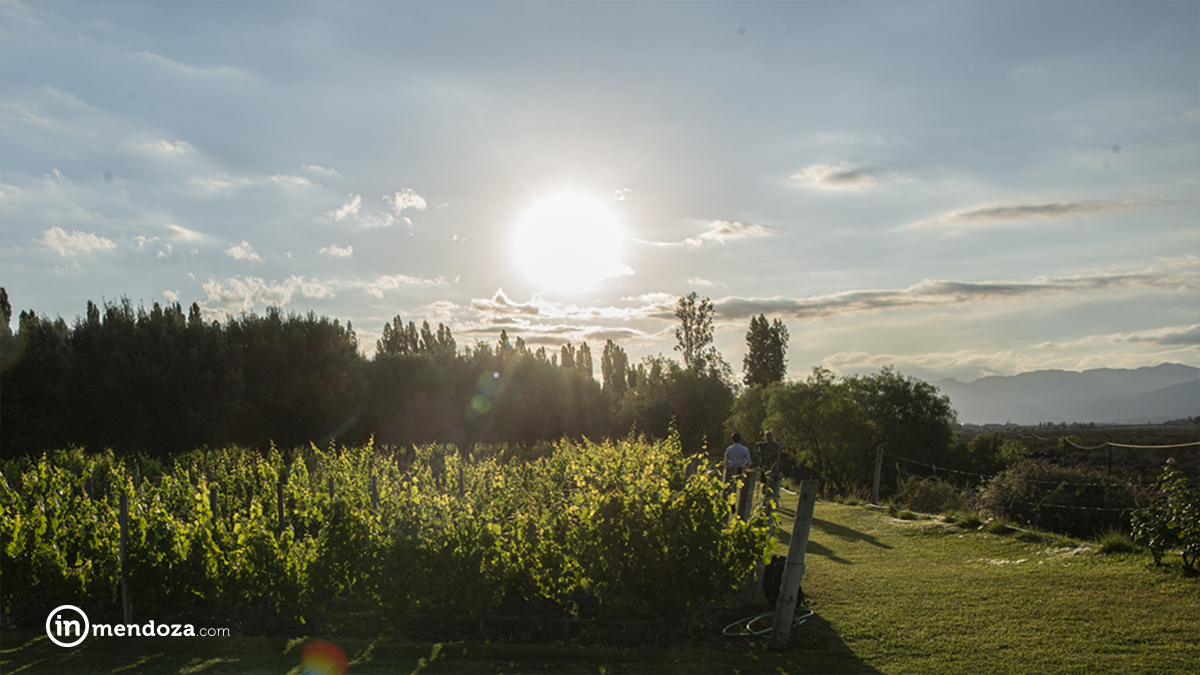 El camino de tierra y viñedos vecinos -más el GPS- nos avisan que estamos arribando a Achaval Ferrer. Tras una pequeña curva ingresamos por un camino de antiguos olivos y llegamos a un jardín con magnífica vista a las montañas y al cauce del Río Mendoza.