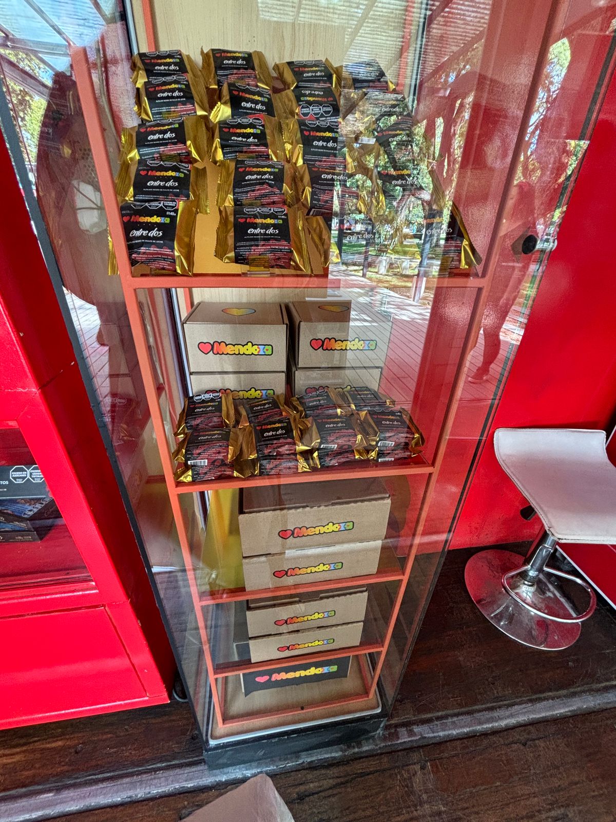 - Caja de alfajores «Amo Mendoza»: Una caja de regalo que incluye una edición limitada de 12 alfajores de chocolate «Entre Dos» rellenos de dulce de leche, acompañados de una postal y stickers.