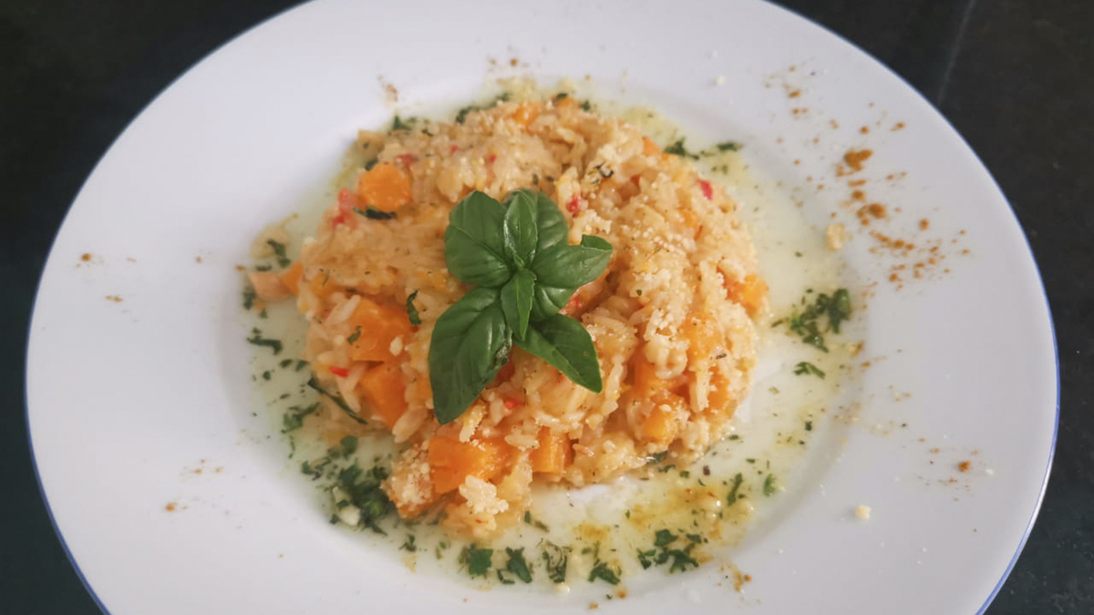 Andrés Fozzatti prepara un delicioso arroz con calabaza y pesto de albahaca y nos comparte el paso a paso para disfrutar de un delicioso plato.