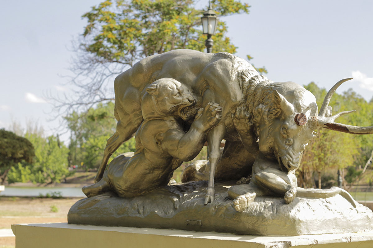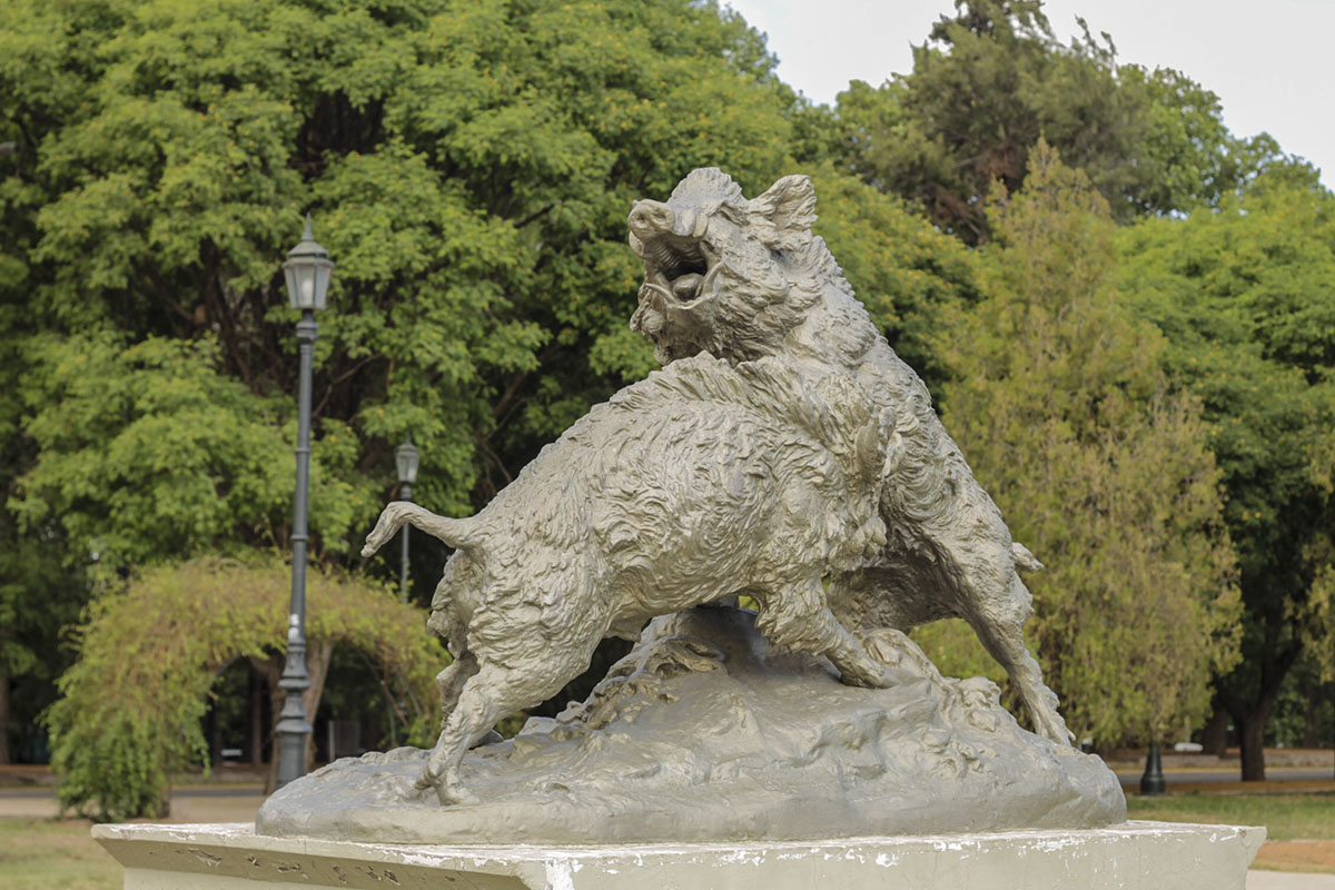 El recorrido finaliza con tres figuras naturalistas. Dos de ellas resultan impactantes: Los jabalíes y Ciervo atacado por leones. Ambas de origen francés, hechas en hierro con técnica de fundición. La última es La Agricultura, una estatua de hierro de la cual se desconoce su procedencia.