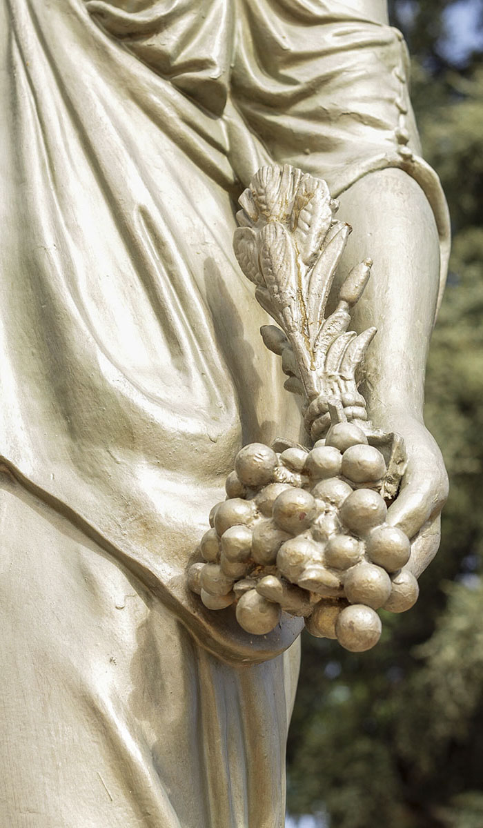 Siguiendo por el mismo camino, en la intersección de las pérgolas, se encuentra la escultura Bacante y sátiro, una obra con temática de origen mitológico. Se trata de una copia del original realizado en mármol por el famoso artista francés Claude Michel, también conocido como Clodion. En este caso la copia es de cemento, pero se desconoce quién la realizó. Las bacantes y los sátiros acompañaban a Baco, el dios del vino, en sus alegres correrías.