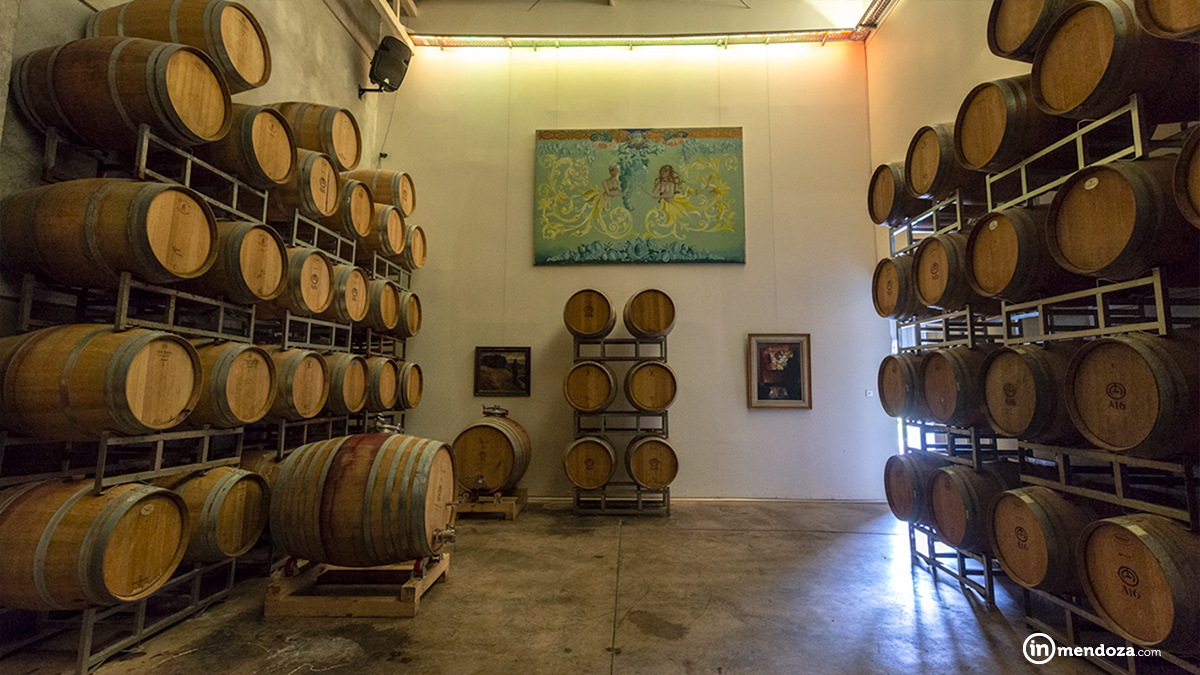 Y al entrar a la sala de barricas, resalta una espectacular obra de Sergio Roggerone. Una pintura de gran dimensión, realizada para la bodega, de una patrona de viñedos que parece contemplar la transformación casi milagrosa de la uva en vino. La composición artística en la pared la completa un cuadro de Antonio Sarelli.
