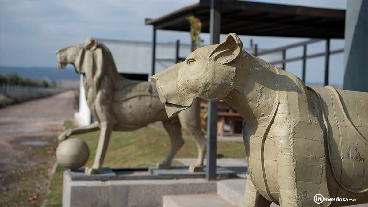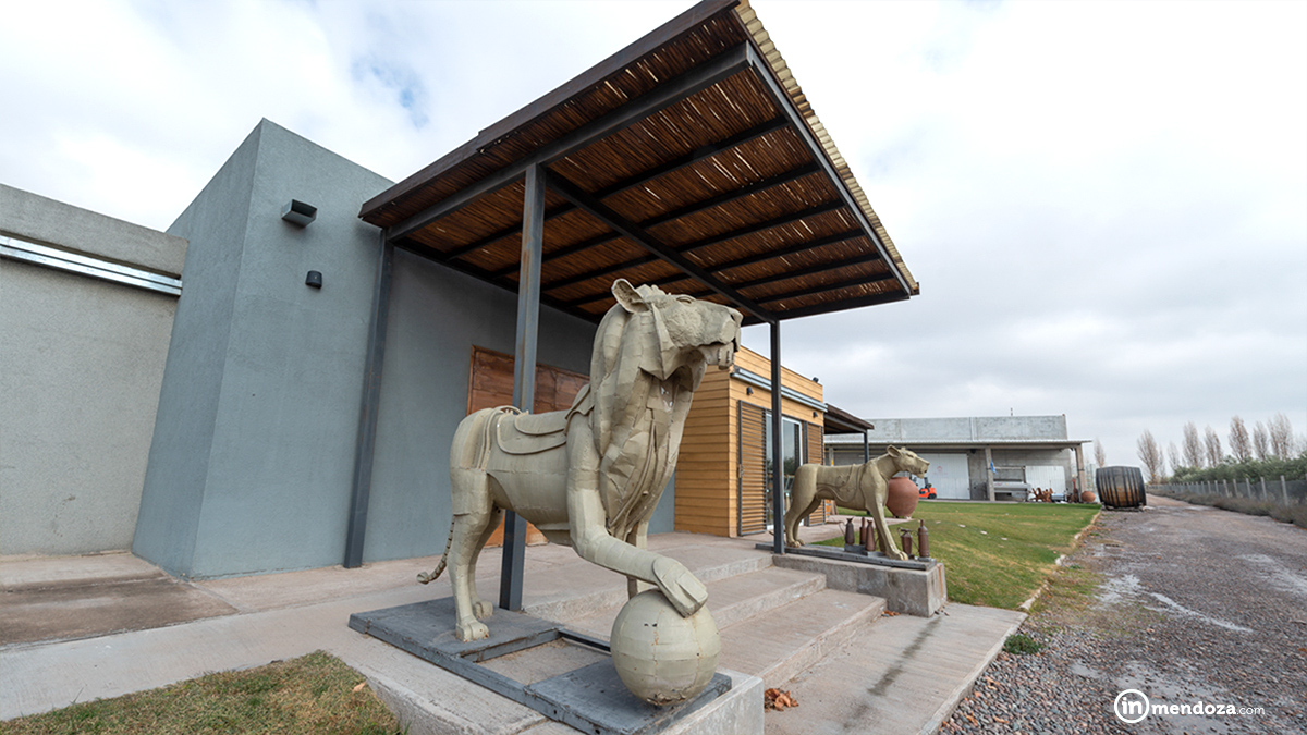 A ésta obra, se le suman dos esculturas imponentes de un león y una leona, también realizados con reciclados, y que cuidan la puerta de entrada al restaurante de la bodega boutique que nació en 2007 y que produce 200 mil litros de vino anuales.
