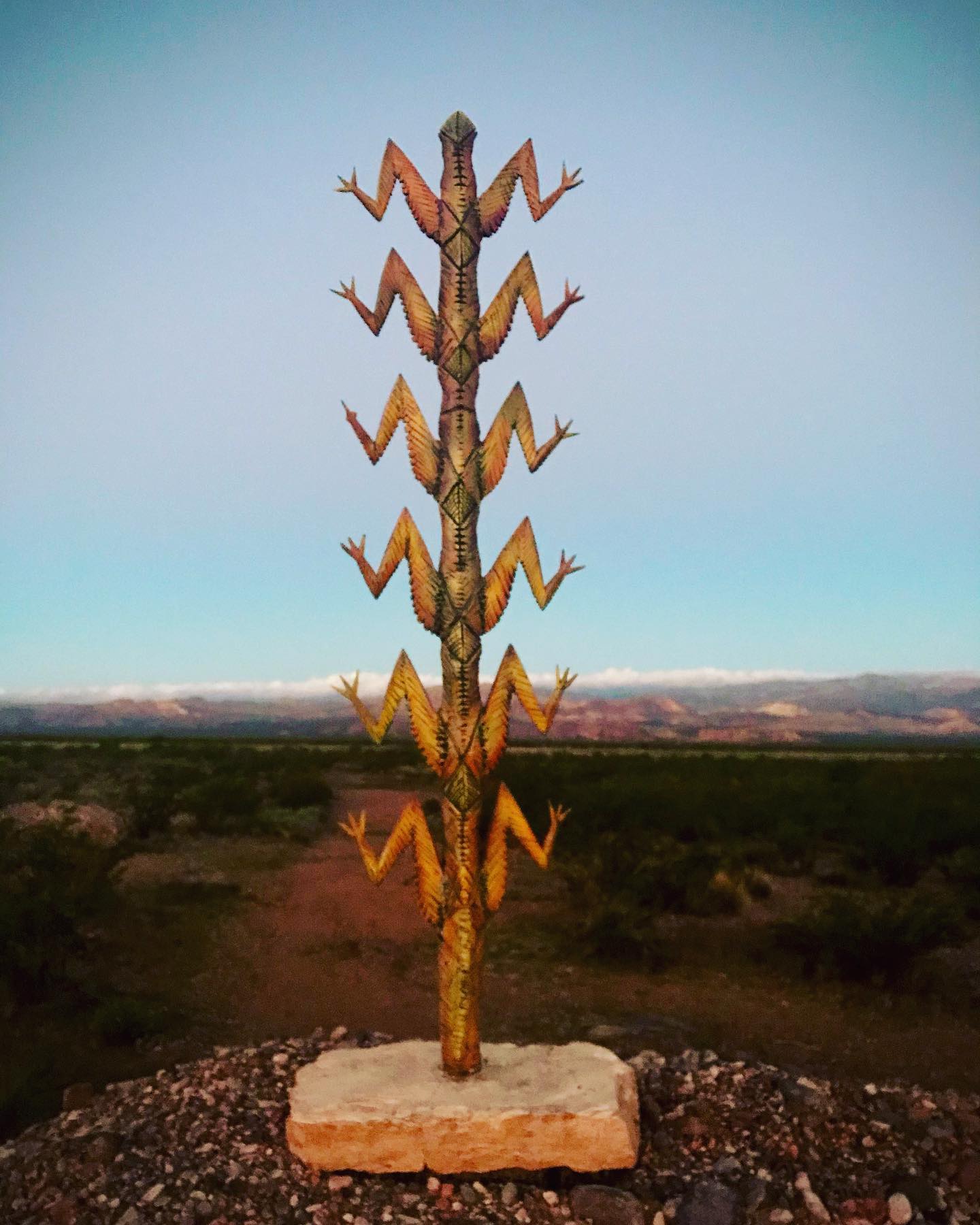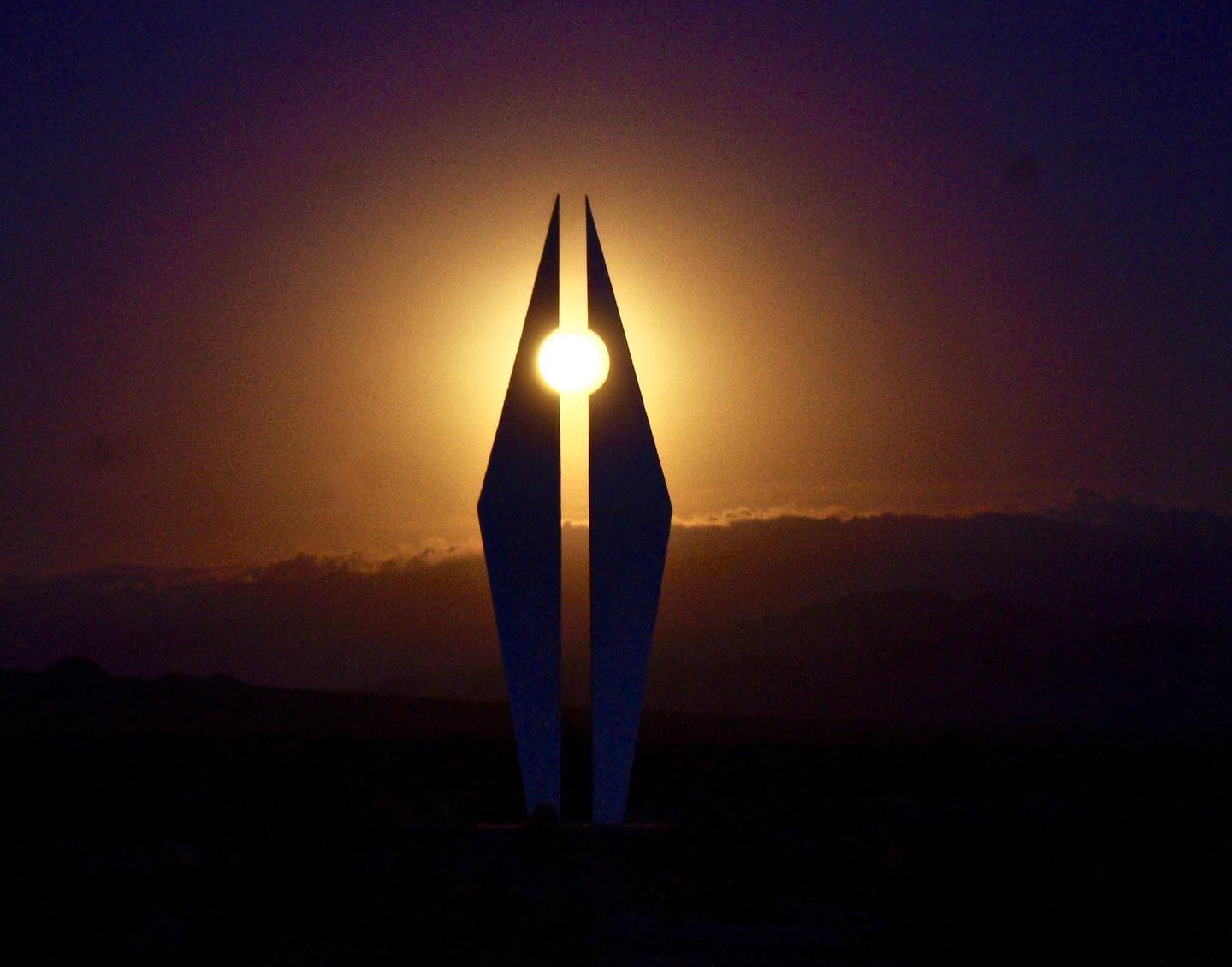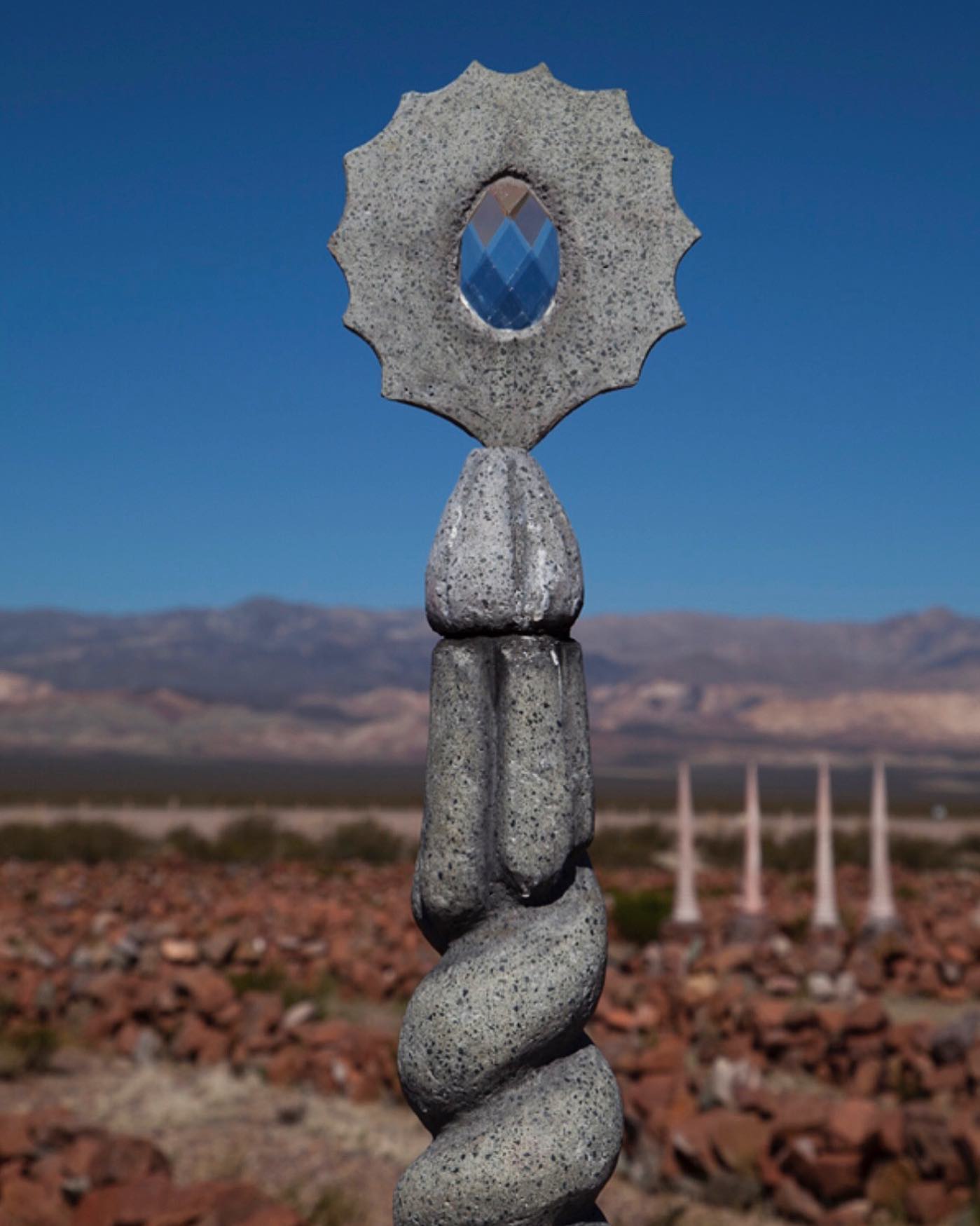 Seguimos por el «Mirador de la luna de otoño», una formación de cerámica realizada por Fausto con una columna que empieza a cubrir la luna cuando sale y cuando se posiciona en su punto máximo queda justo en el medio del círculo. Vamos hacia «La cruz del sur», «El cardón», «El abrazo» y «Águila del sol y la luna», quizá la escultura más alta con unos 5 metros de alto; es mármol reconstituido y lleva a los dos grandes guardianes, el águila que custodia nuestros cielos y la serpiente que es la madre de la tierra. Esta obra representa la conexión del cielo y la tierra, del sol y la luna.