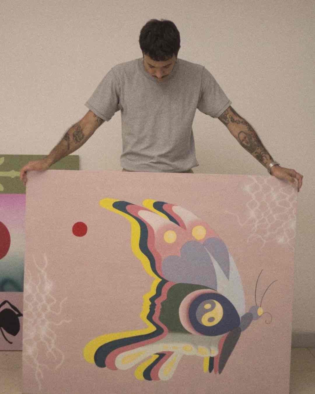 Con el tiempo, Bonaceto encontró en la pintura sobre bastidor un punto de fusión entre todas sus disciplinas. La búsqueda de un lenguaje propio lo llevó a desarmar lo aprendido: romper líneas, alterar colores, escapar de lo hegemónico. Su paleta, antes saturada para que se vea en la vía pública y para que perdure en la piel, ahora se apaga y se ilumina con tonos quebrados, rosas pasteles, celestes y naranjas suaves. “Estoy en una transición donde lo estructurado del graffiti y el tatuaje se une en algo más pictórico, más contemplativo”, cuenta.