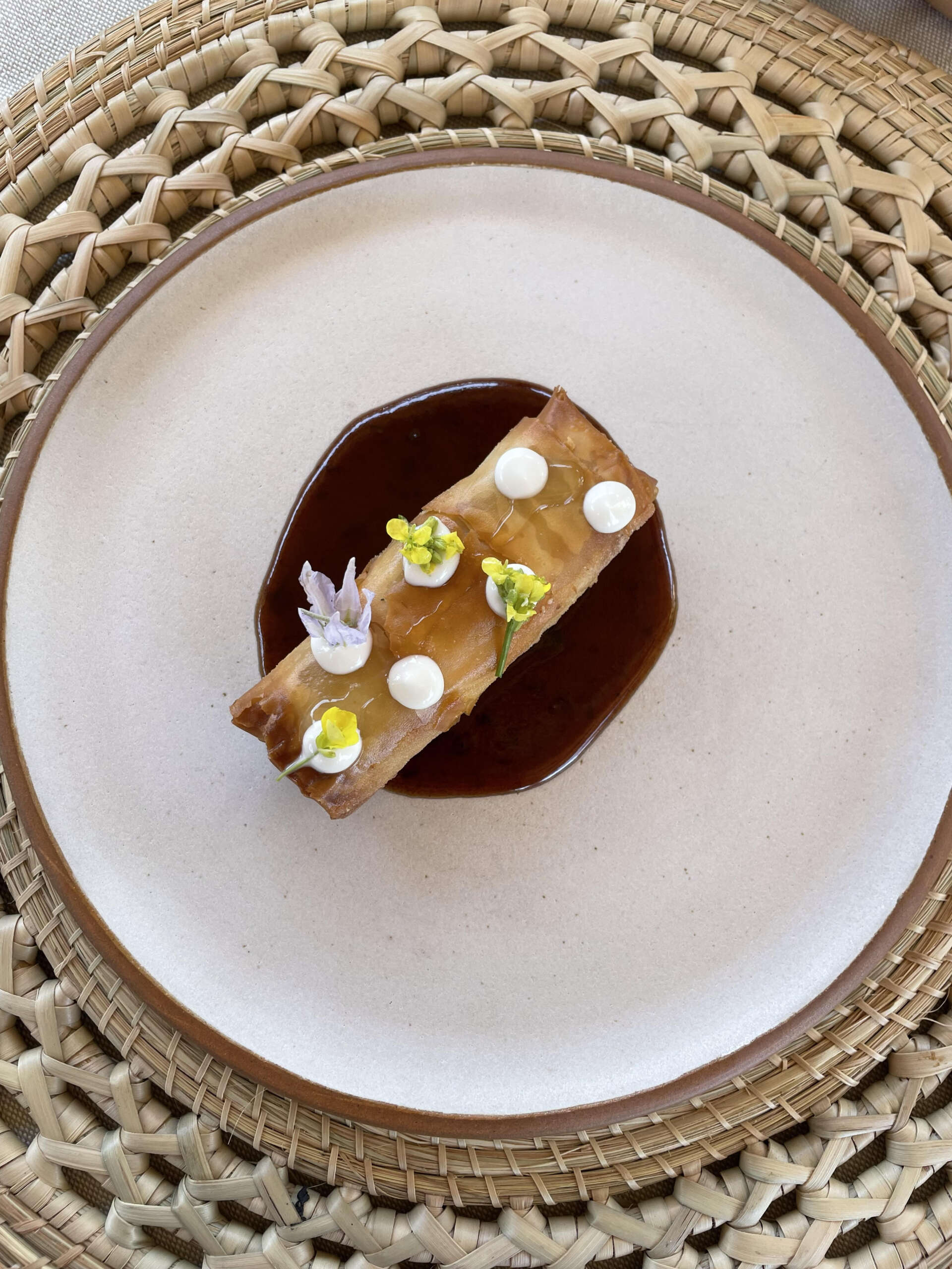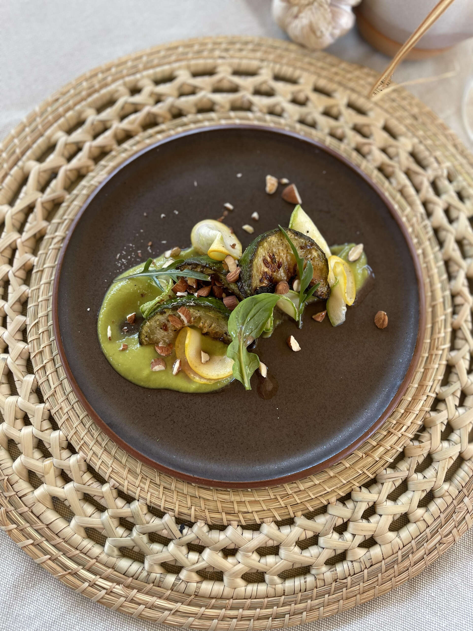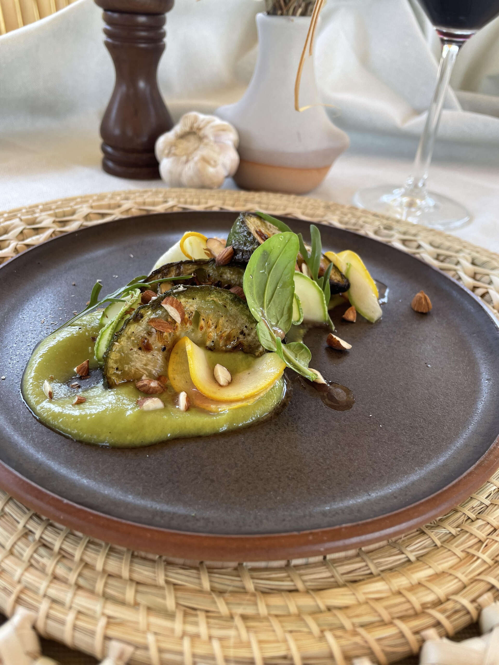 Para el quinto tiempo se sirve el corte cuyano de res por excelencia, una punta de espalda braseada con boniatos al rescoldo, puré de higos, cebollas y reducción de vino. O su variante de fruto noble de la huerta con un fresco acompañamiento: berenjenas asadas, hierbas, cremoso de maní y tahine, pesto y peperonata.
