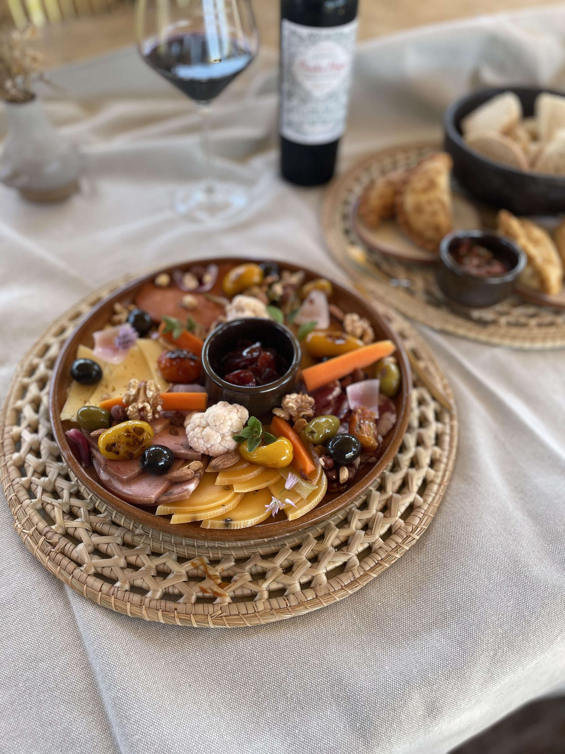 Se sirve una tabla de fiambres y quesos para compartir entre dos, más cuatro empanaditas de carne, panera y una botella de vino a elección entre tres opciones dadas. La opción veggie es de puros quesos, los mencionados más pategras y azul. Y las empanadas se elaboran con queso y cebolla caramelizada.