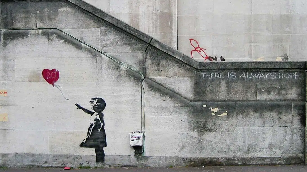 El artista callejero anónimo Banksy (1974, Inglaterra) inició sus pasos en el movimiento grafitero siendo adolescente en su ciudad natal, Bristol, registrando su firma en trenes y calles en 1993, y ya hacia el 2001 sus obras de stencil (plantillas y aerosol) estaban en todo el país.