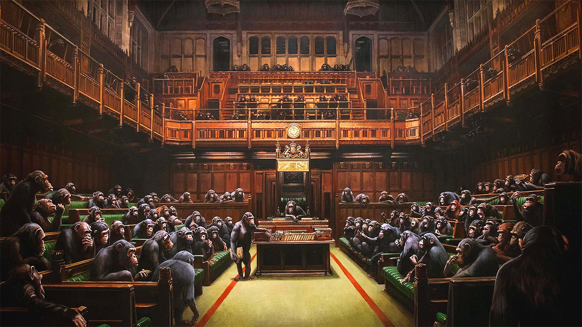 Otra es la pintura de grandes dimensiones Parlamento involucionado (2009) donde representa la Cámara de los Comunes invadida por chimpancés, que fue subastada en 2019 con un precio récord de 12,1 millones de dólares en Sotheby’s, en medio del debate sobre el Brexit.