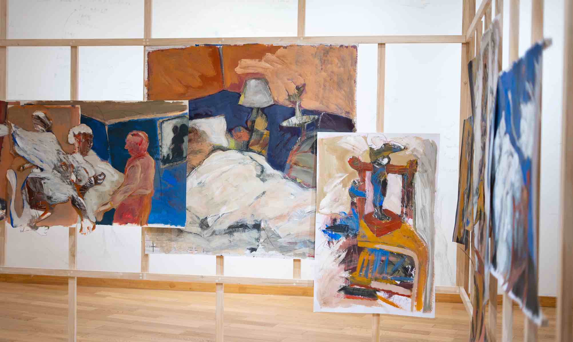 Si el nivel inferior era el esqueleto y las sombras, en el segundo piso se respira amplitud. Hay más luz y resalta en las paredes un tono coral. Cecilia revela que este color remite a la piel, a la intimidad. Acá nos encontramos con pinturas de gran formato sobre bastidor y tela, el hábitat natural en el que Carreras confiesa sentirse más cómoda y libre. Son cuadros de dimensiones imponentes, con una paleta en la que predominan los ocres, amarillos, azules profundos y rojizos. En ellos persiste la temática del sueño, la cama (un guiño a su muestra anterior, «Habitar la Piel», presentada en junio de 2025), del gato que parece flotar y de los espacios que oscilan sobre la delgada línea entre la figuración y la abstracción.