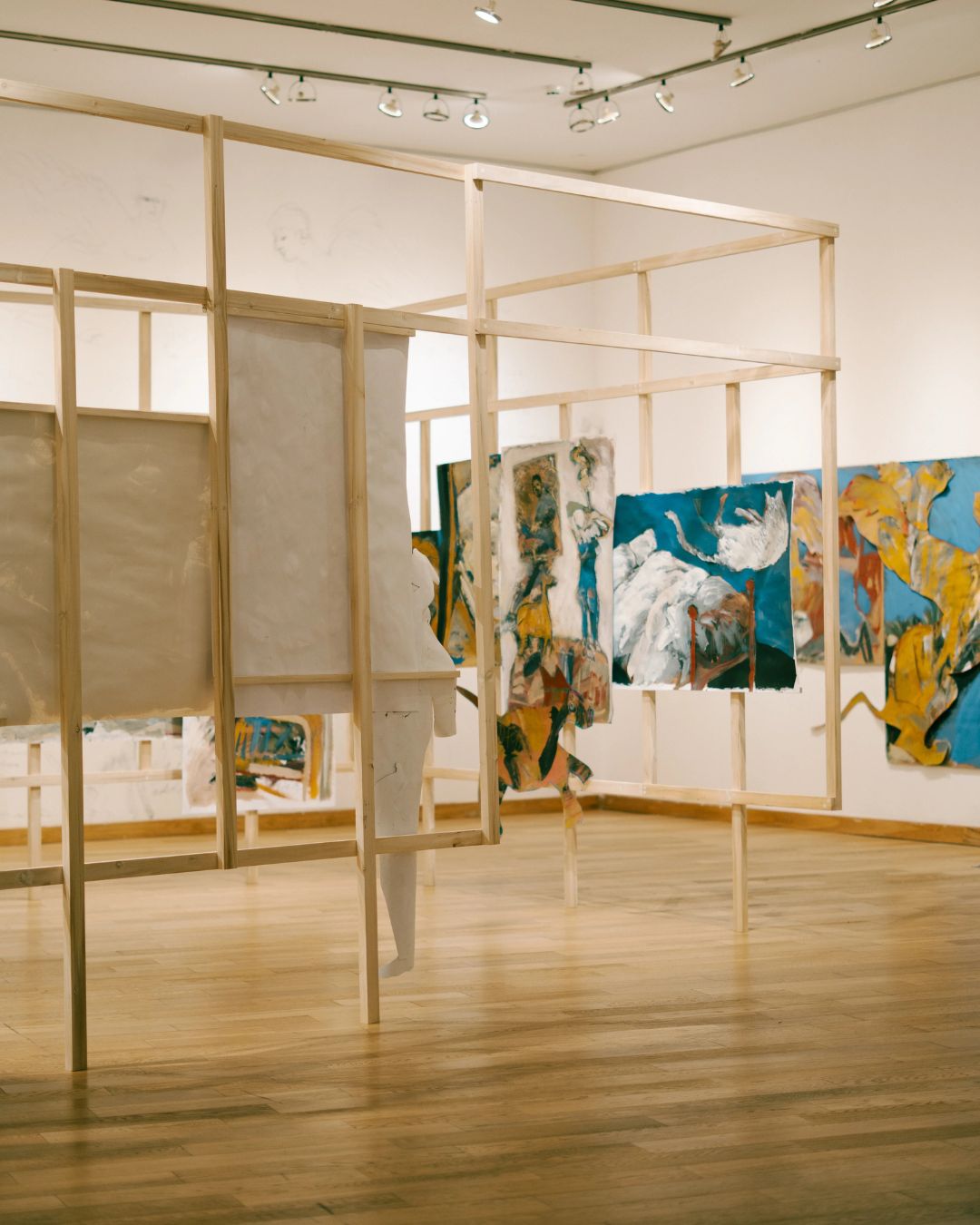 Subimos al primer piso y la percepción del espacio cambia drásticamente. La sala clásica del museo ha sido intervenida de una manera que descoloca y fascina. Una estructura de madera, similar a los caballetes o al esqueleto de una casa en construcción, serpentea por la habitación guiando nuestros pasos. Las luces son tenues, creando una atmósfera de intimidad.
