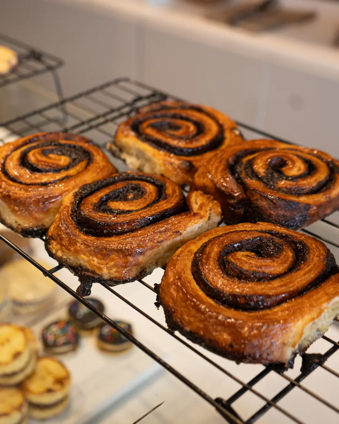 El roll de canela tibio es todo un festín de sabores; te envuelve con su aroma y con la combinación perfecta de canela y azúcar. Y no podemos dejar de mencionar el alfajor de pistacho: masa sablée rellena de ganache de pistachos más trozos de pistachos que le aportan textura a la experiencia dulce. El de chocolate blanco y frambuesa nos sorprendió y nos puso difícil la decisión.