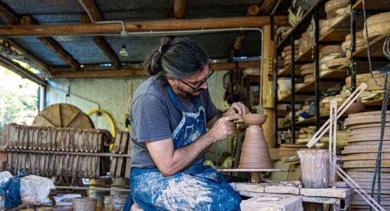 En su laboratorio alfarero, donde la química, el fuego y la experimentación constante marcan el camino, el ceramista transforma la tierra en vajilla de autor y esculturas viscerales.