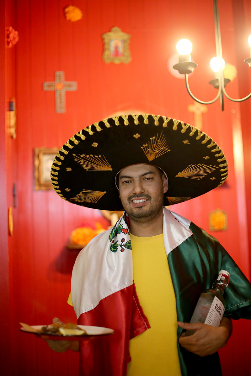 De hecho, en el local tiene su propio altar; está su figura junto a imágenes de la virgen, una cruz, la botella de mezcal y de tequila, calaveras, el clásico sombrero y hasta flores de cempasúchil. Este rincón es bien tradicional, para la cultura de México los altares tienen un gran sentido y dicha flor es la representación muy típica que marca el camino para los difuntos.