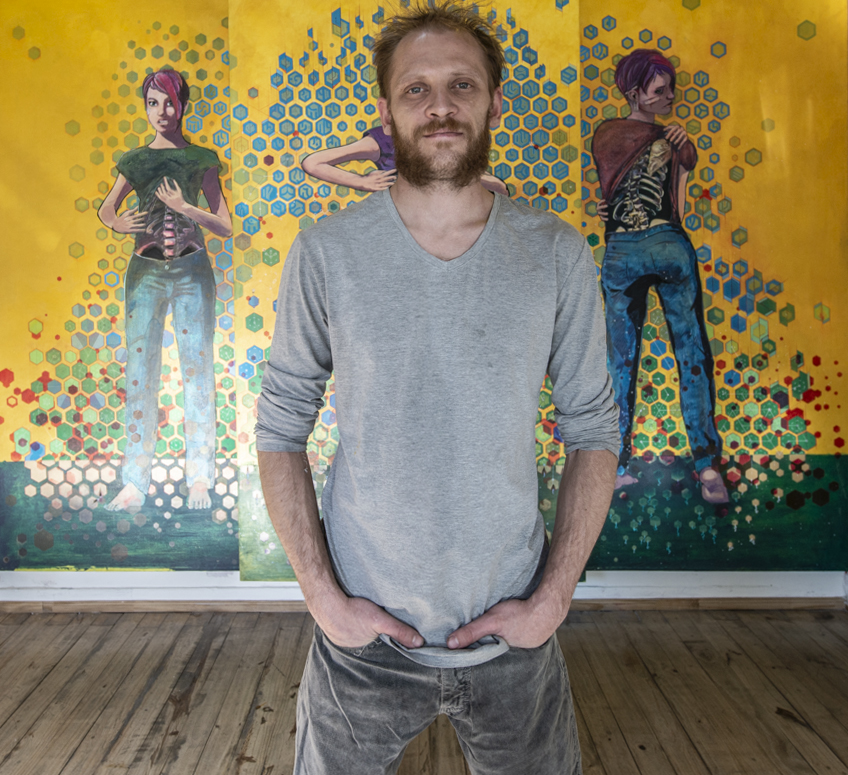 Su nuevo trabajo, «La propia sombra», se puede ver en la galería de Facundo Piazza, esa suerte de espacio vecinal de puertas abiertas al arte de todos y para todos. Desde la calle se ve el tríptico de mujeres gigantes, estéticamente bellas, de colores suaves.