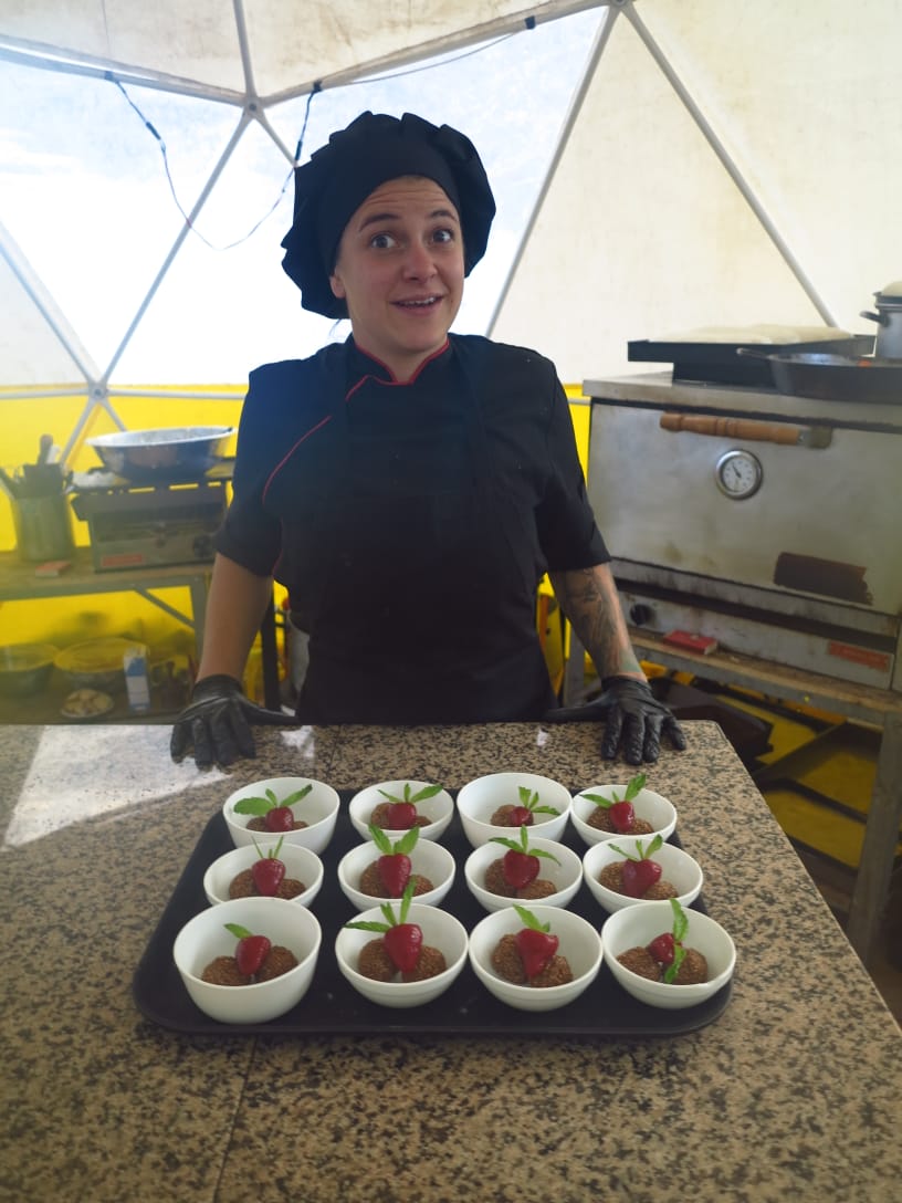 En su aventura de cocinar bien en lo alto y en una cultura diferente a la nuestra, la chef tuvo que expandir el repertorio de ingredientes y conocer algunos autóctonos, como las carnes. «Tuve que aprender a manejarlas porque comen mucho búfalo y yak que son súper fibrosos y duros por lo que llevan otros métodos de cocción. ¡Imposible hacer un churrasquito!».