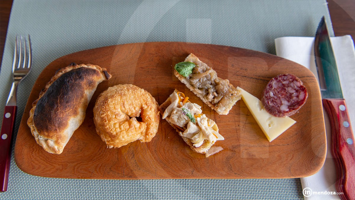 Los sabores de Mendoza están en la entrada en los pastelitos de provolone y cebolla caramelizada, la picadita de queso y salame, escabeches caseros, y las infaltables empanadas de carne. Para completar, se ofrece una variedad de panes exquisitos elaborados a la vista.