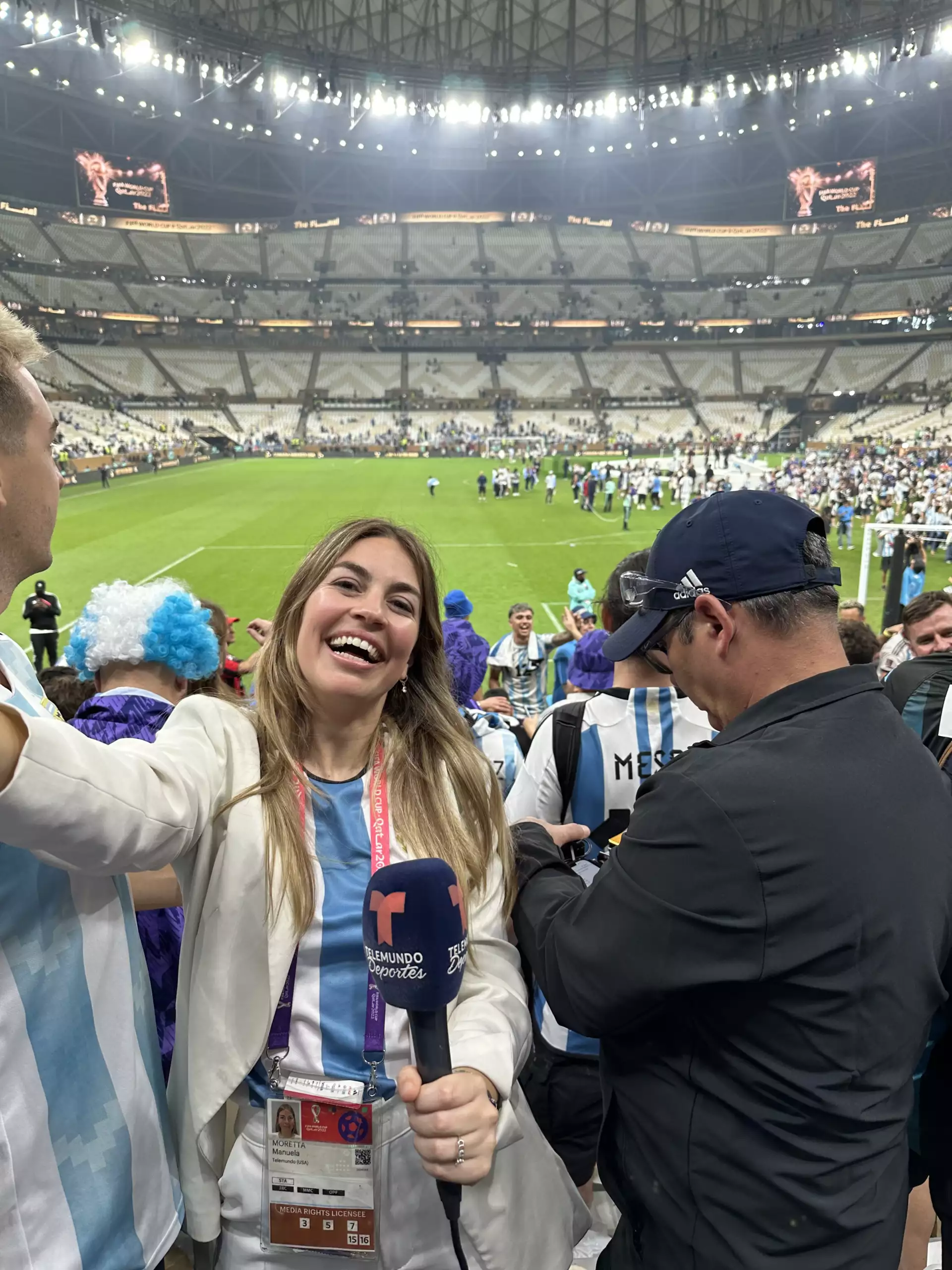 El salto a lo internacional llegó cuando fue contratada por TVN y luego por Telemundo – NBC Sports. Esto marcó un antes y un después en su carrera, con oportunidades que la llevaron a recorrer distintos países y vivir experiencias únicas. Pero hay un momento que brilla por encima de todos: el Mundial de Catar 2022. Allí, Manu fue la única mendocina acreditada por la cadena estadounidense para cubrir a las selecciones de Argentina y Uruguay, además de captar historias de hinchas y personajes inolvidables. “Fue un antes y un después. Me animé a renunciar a mi trabajo en Mendoza después de más de 10 años, apoyada por mi familia. Salir de la zona de confort fue difícil, pero totalmente necesario”, cuenta.