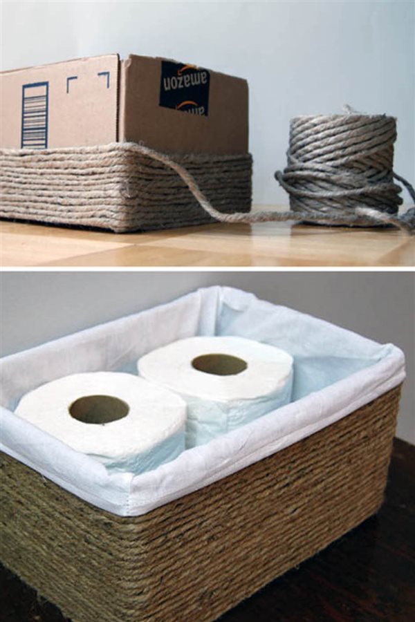 Un objeto que está muy de moda son los cestos para guardar lo que quieras y así tener el sitio organizado: juguetes, cosméticos, mantas, frutas, papeles importantes… ¡todo! Con ayuda de un cordón rústico, transformás cajas de cartón y latas de conserva en elementos de almacenaje extra.