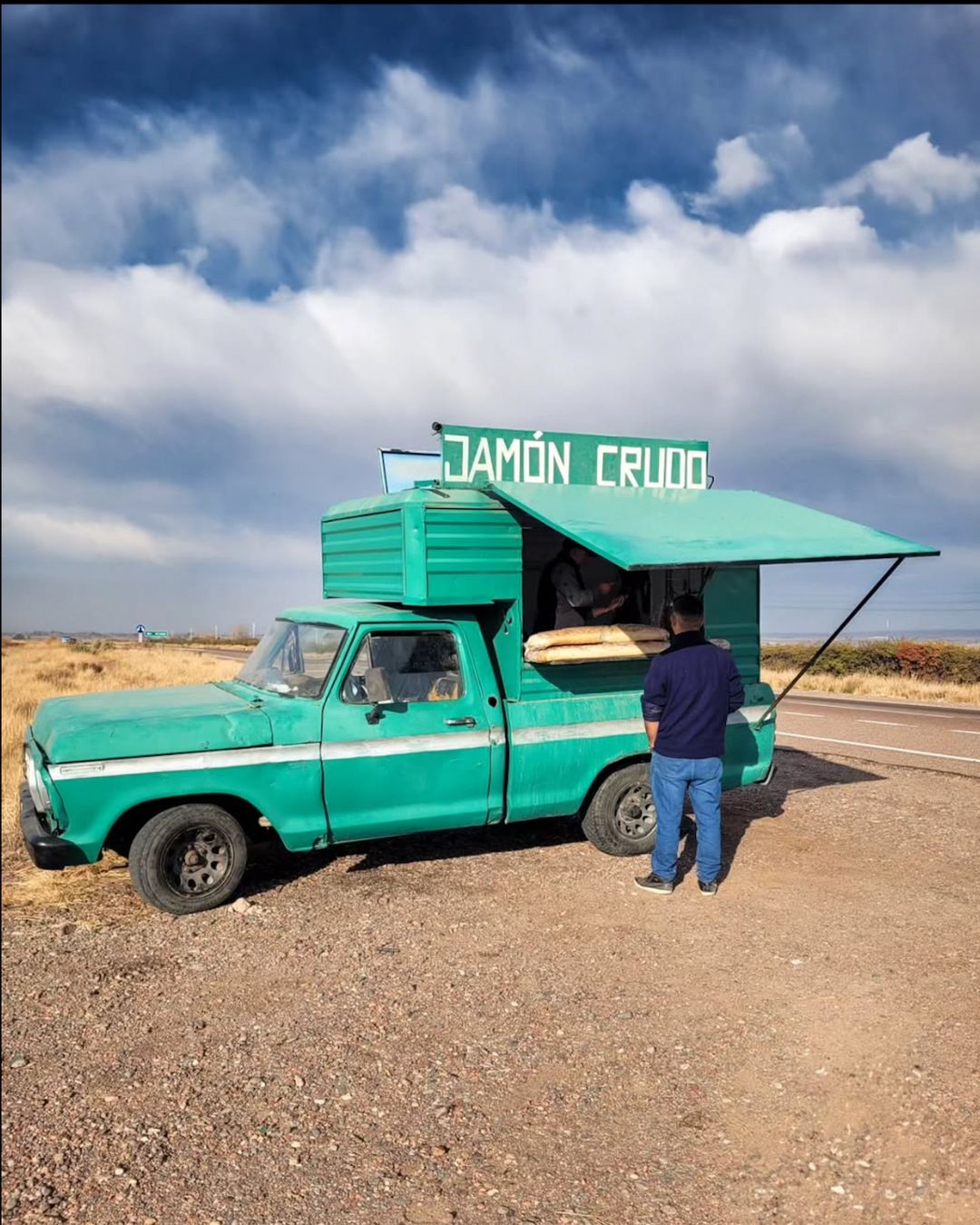 Y camino al Valle de Uco está la famosa camioneta verde, sobre la Ruta 40, con su cartel característico que dice, justamente, “jamón crudo”. Marcelo confiesa que el negocio familiar nacido hace casi 20 años no tiene nombre ni redes sociales pero sí, un muy buen boca en boca. Solo venden sándwiches en pan casero con aceite de oliva, patas o trozos por kilos del jamón que ellos mismos elaboran y eso basta para convertirse en la mejor parada rutera, cualquier día de la semana y fin de semana.
