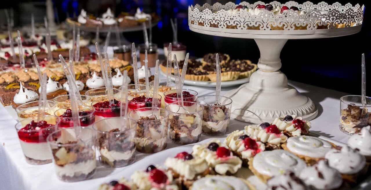 Las mesas dulces para eventos de gran envergadura son mesas más elaboradas. Al tener más cantidad de productos pasteleros y ser una mesa más grande se puede jugar con las alturas, los colores o hacer espejos. La vajilla juega un papel fundamental en el momento de la presentación.