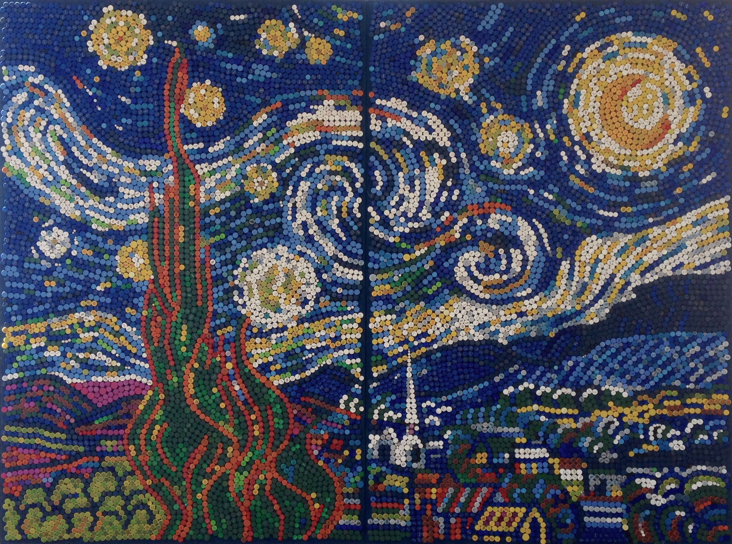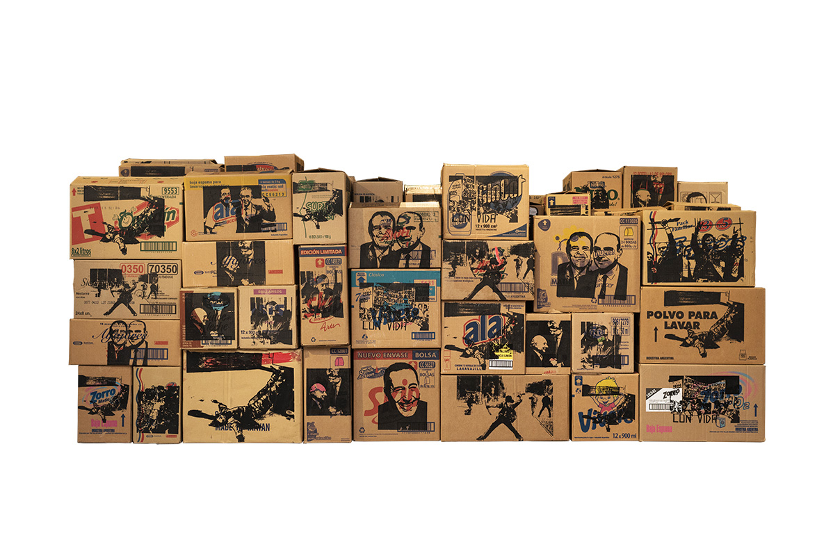 A mi me gusta la innovación por eso en el 2003 emulé lo que hacían los cartoneros y me fui a la calle junto a mi pareja (la fotógrafa Sabrina Kadiajh) a juntar elementos que la sociedad consumista tira. Los cartones y las tapitas fueron los soportes más convenientes y empezamos a jugar. Lo primero que hicimos fue un retrato grandísimo del Che Guevara, durante meses y en el piso.