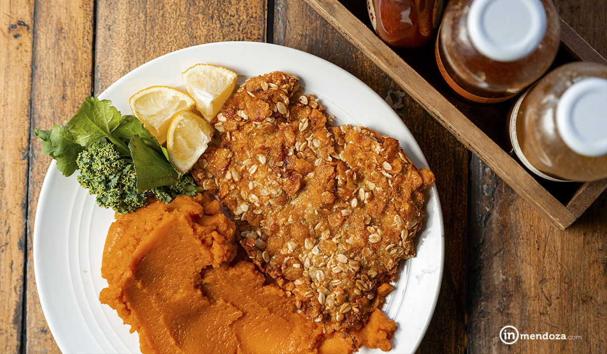 Para quienes comen carnes se incorpora una milanesa de pollo rebozada en cereales y avena con mousseline de calabaza. Todas las propuestas maridan a la perfección con sus jugos naturales y con su coctelería clásica.