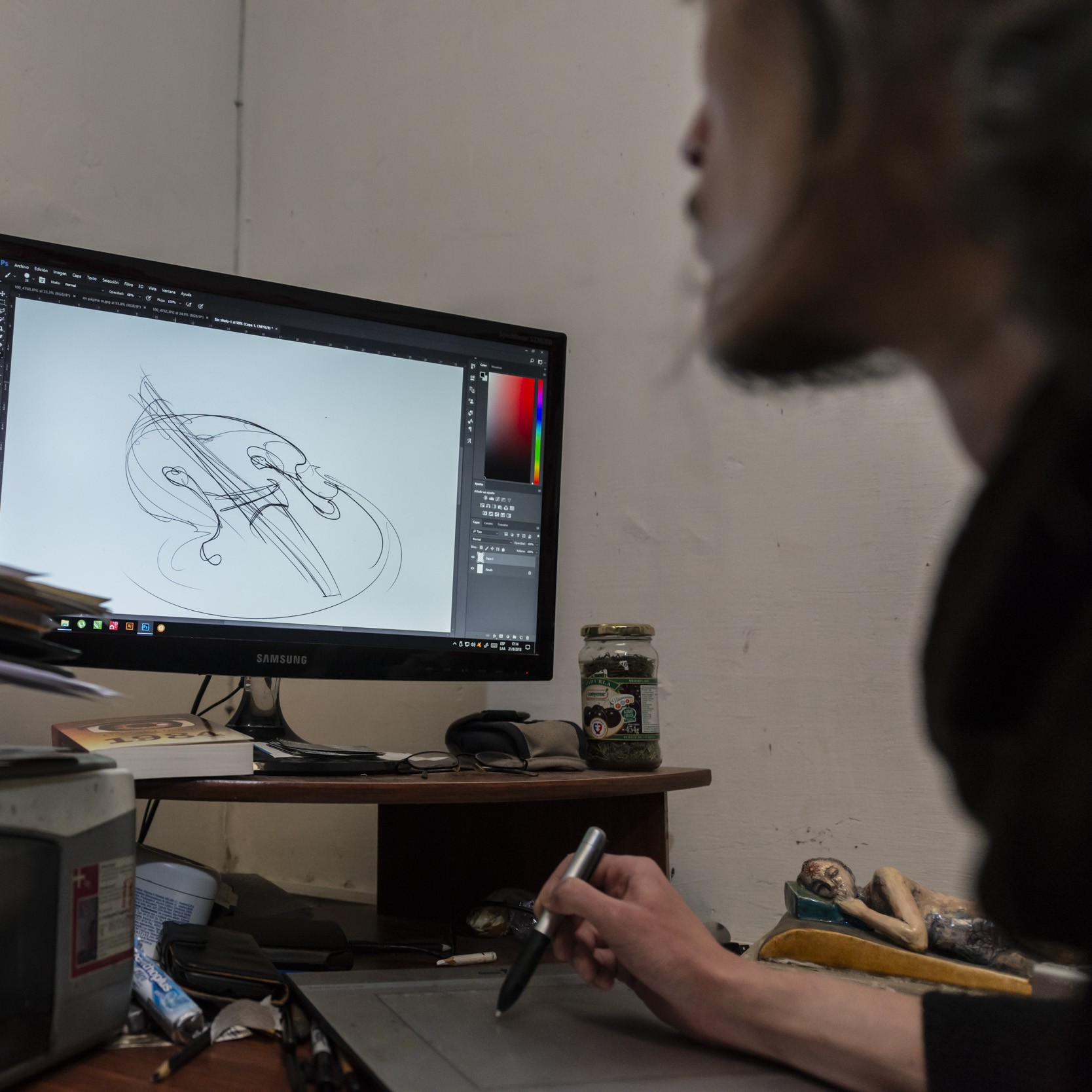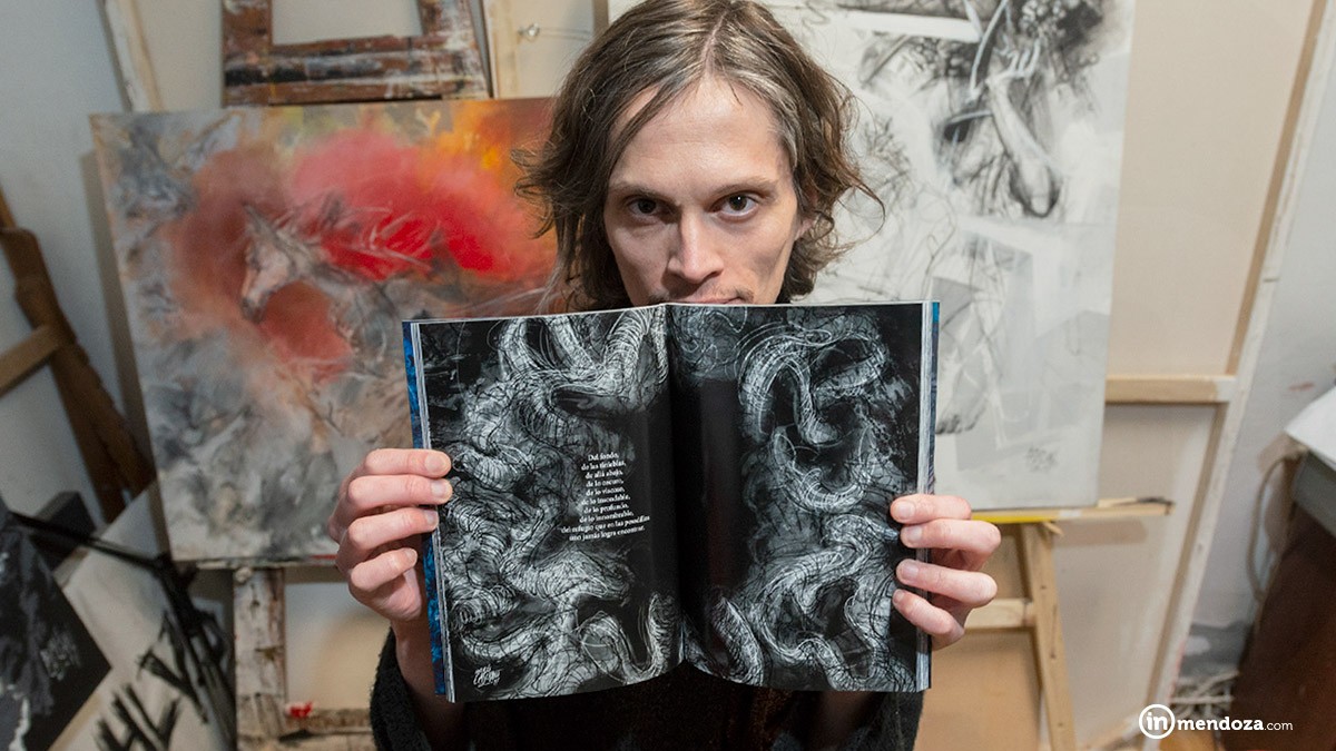 Con El Flaco Spinetta de fondo y mates de por medio, conversamos de sus proyectos -que son varios y que suceden en simultáneo-, de sus musas y de sus preferencias a la hora de ilustrar. El joven tomó de Luis Scafati y Carlos Nine la ruptura del límite de las artes plásticas, la ilustración y el humor gráfico y con ello definió su dibujo expresionista que tiene un enfoque altamente plástico.