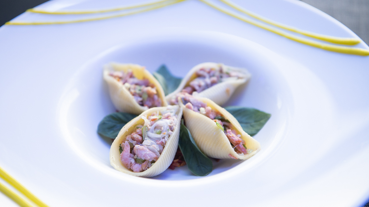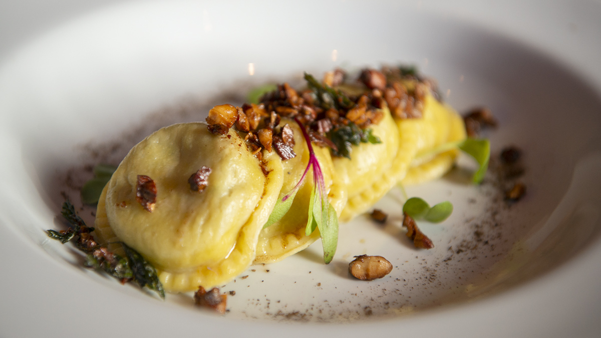 A la hora de las pastas, salen de la cocina conchiglioni con trucha y verdeo sobre cubeteado de tomates secos hidratados en manzanilla y albahaca fresca; también Cintas de yemas con variedad de hongos y queso de cabra local.