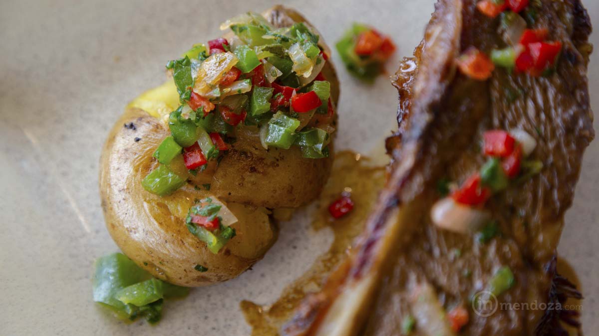 El principal propone ojo de bife o costillas de tres cocciones con papa crocante al limón, chutney de repollo colorado y tomate confitado. Cinta de espinaca, crema de tomate cherries, hongo de pino y brócolis más semillas de girasol crocante, o trucha de Malargüe acompañada de ensalada fresca de coliflor y vegetales más puré de batata con café.
