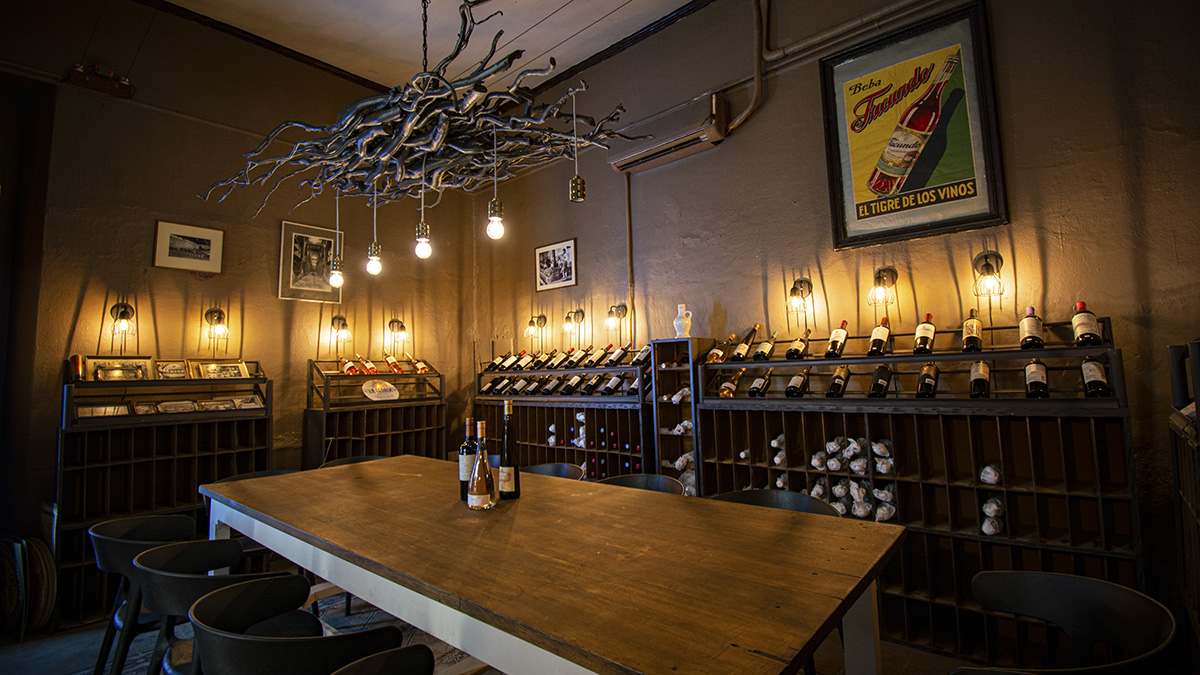 Es que hay vino tirado, un vino de la casa elaborado por Marcelo Pelleriti que le brinda la chance al comensal de servirse su vino y hasta de hacerse uno propio porque pueden combinar los varietales distintos que salen de las canillas: Malbec, Syrah y Cabernet Franc.