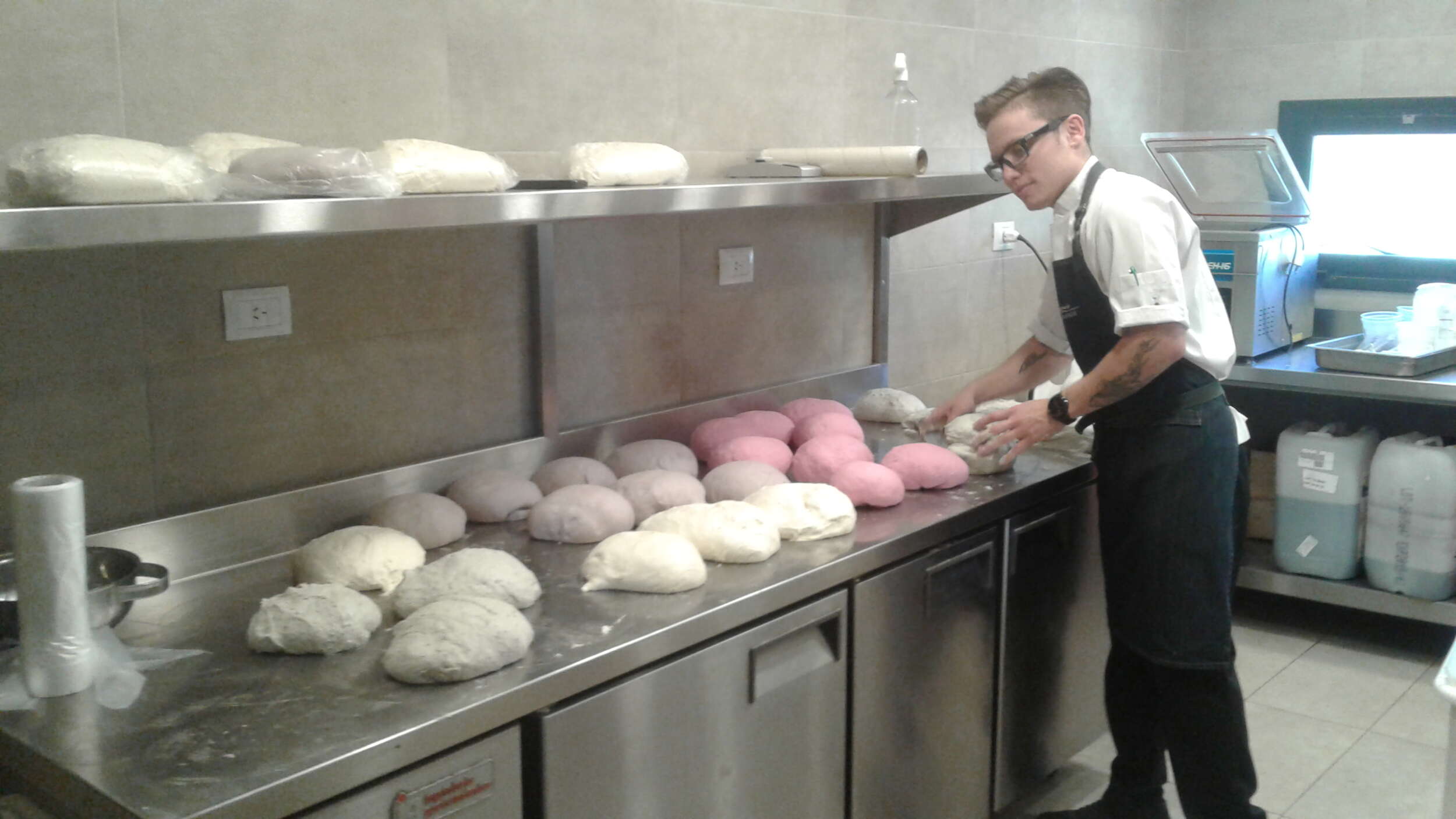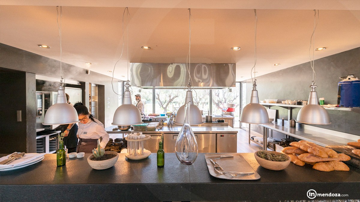 «Cuando tenés la huerta a diez metros de la cocina, guardás los productos en la planta, no los guardás en la heladera». Dicho esto nos invita a la mesa pero antes pasamos por la cocina y vemos los panes que amasa Agustín Roldán, un maestro que prepara panes de ceniza, de remolacha, otros que llevan las borras de Malbec. Sus colores nos llaman la atención.