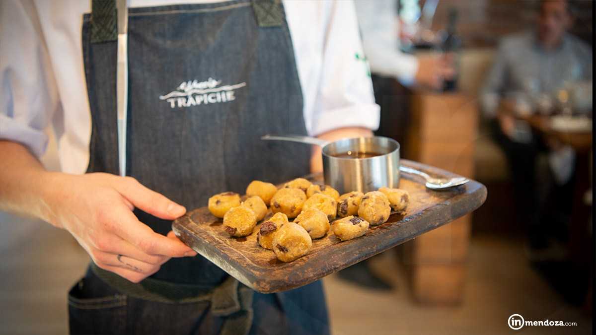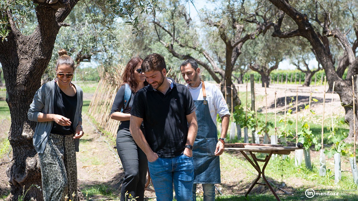 Lucas Bustos, chef de Espacio Trapiche, recién llegado de Australia y aún con los efectos del jet lag nos muestra paso a paso cómo se genera un plato para maridar un buen vino. Las variables que intervienen en su elaboración son tan precisas y cuidadas como las del propio vino. Y bajo el concepto de «km 0», o «de la huerta al plato, Lucas nos hace un paseo guiado por los cultivos biodinámicos donde crecen más de 300 variedades frutihortícolas, entre ellas 42 tipos de semillas de tomates (negro, blanco, florentino, y otras variedades muy delicadas que jamás conseguiríamos en el mercado). Magdalena Rogé, especialista en biodinamia es la responsable de esta huerta donde además se genera un gran banco de semillas y almácigos. «Las semillas se clasifican y se comparten para no perderlas», nos explica Lucas.