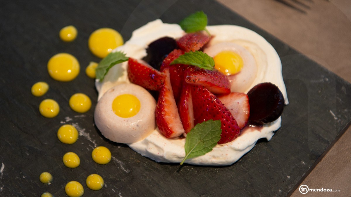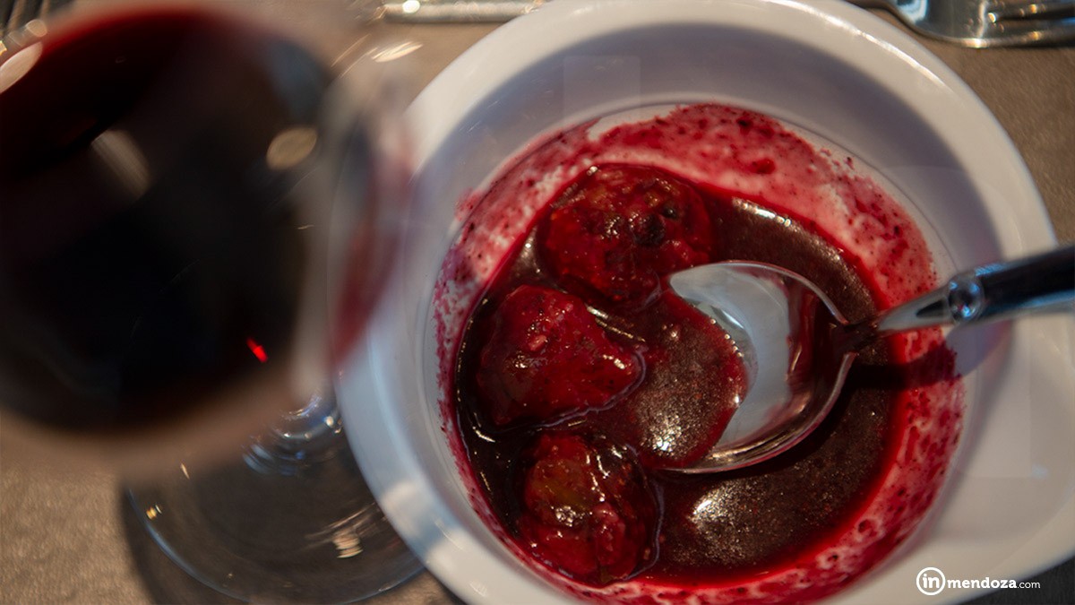 Con la menta y la pimienta, iniciamos una divertida molienda en el mortero, y mientras los elementos naturales despiden sus aromas, Lucas nos sugiere pensar en un Cabernet. Acto seguido espolvorea sobre cada cuenco granos de sal de Cabernet, más tarde cáscaras de zapallo disecadas y polvo de remolachas. Los aromas son intensos y fantásticos, se suma a la mezcla un «fondo de oscuro», caldo muy salado que le dará a esta sopa toda la potencia del Cabernet, luego unas croquetas de hongo y pasas de uva, definen el plato perfecto para maridar con el Cabernet de la casa que sirve Rodrigo Kohn, head sommelier de Trapiche, en un sofisticado (y enroscado) decanter Riedel Eve. Como si la presencia de Lucas Bustos no fuera suficiente, entre las mesas se pasea Daniel Pi, enólogo de Trapiche con quien Lucas define «la deconstrucción aromática de los vinos» para armar el menú.