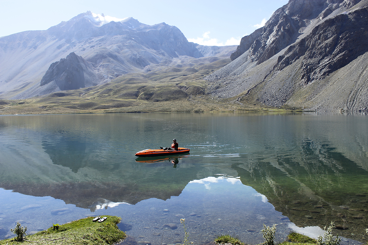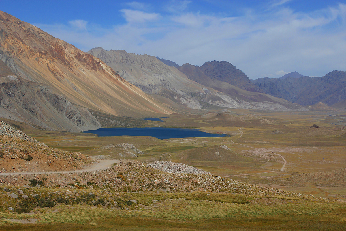 Hay que andar 29 km más desde el centro de esquí por el mismo camino de ripio siguiendo el curso del río hacia el oeste. Una hora y media de ritmo sinuoso. Pasamos La Condorera, Quebrada de la Virgen, Playa Ancha y trepamos hasta El Mirador donde aparecen los espectaculares colores del valle. Un peñón nos marca el punto perfecto para contemplar las dos lagunas que alberga Valle Hermoso. La huella en forma de caracol desciende hasta la primera laguna, donde un parador nos espera con los únicos servicios con que cuenta el valle.