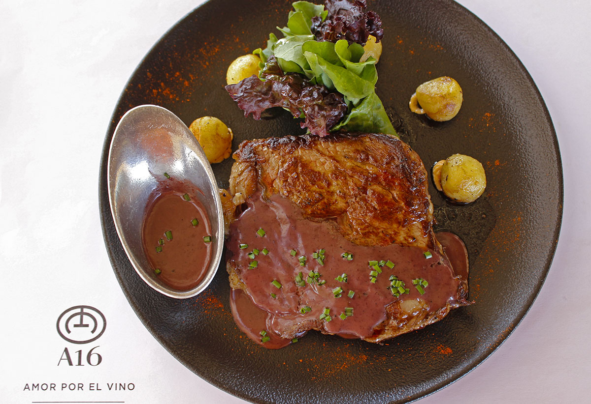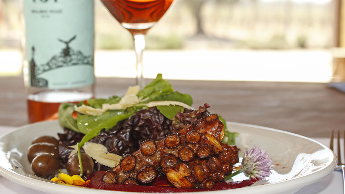 Para el primer paso nos ofrecen tres opciones: empanadas A16 de vacío cortado a cuchillo (pasteles fritos, terminados al horno de barro); empanadas de zanahoria, queso azul y nuez, o una ensalada de pulpo con coulis de beteraba, olivas negras, mix de verdes y parmesano. Se acompaña con un Auge Rosé.