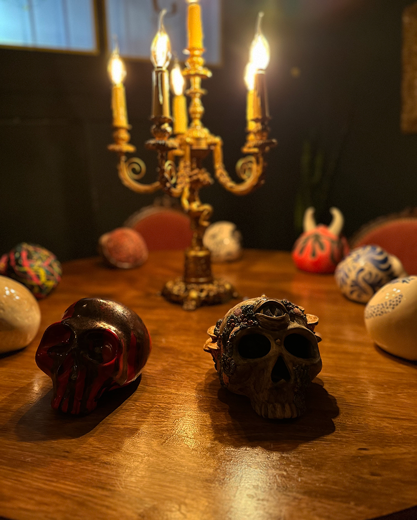 En el siguiente cuarto de la casona, sobre una mesa redonda iluminada por una enorme araña dorada, se encontraba dispuesta la obra de María Almodovar. La arquitecta de profesión y ceramista por vocación, presentó su obra «Memento mori», una serie de calaveras elaboradas en cerámica. La gran puesta creó un ambiente espectacular.