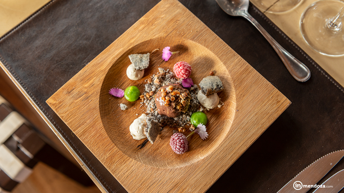 Para el plato principal, un filete de ternera, vegetales baby de estación, emulsión de remolacha, lentejas cremosas y chimi churri. Lo dulce viene en dos tantas: el pre postre, con arándanos helados y jalea de pimientos picante, y el postre: un sablée de api (maíz morado), crema de vainilla, helado de chocolate y matcha, néctar de arvejas y praliné de lentejas turcas.