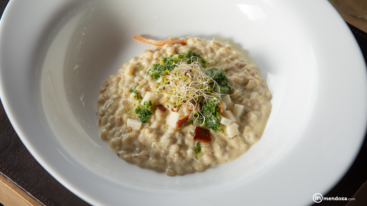 Para el appetizer: Sopa de calabaza y pimiento ahumado, migas de pan integral crocante, langostino, y crema de sumac (especie de medio oriente). A la hora de la entrada, una crema de coliflor y cebada perlada, panceta crocante, queso de cabra fresco y dressing de naranja, perejil y parmesano.