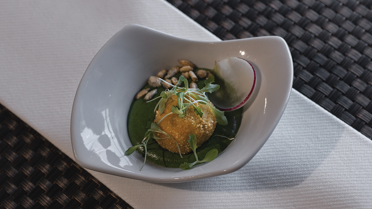 Para empezar se sirve un cremoso de espinaca, ricota especiada y praliné de girasol que marida con el vino Decero Signature Syrah 2017. Tras el appetizer llega la entrada, una crema de zanahoria y pimientos asados, crocante de hongos de pino y parmesano, emulsión de mandarinas y tomate asado, acompañada de un Decero Signature Cabernet Sauvignon 2018.