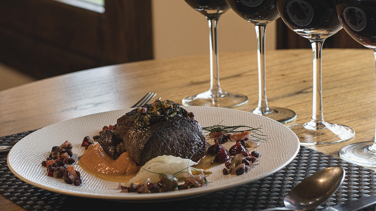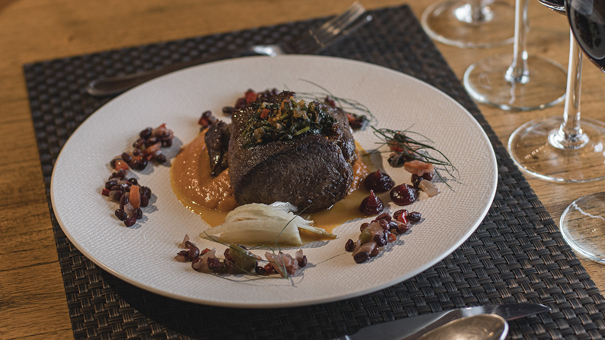 Para el plato principal, el chef ideó un filete de ternera, chimichurri fresco, calabaza asada con naranja, escabeche de porotos aduki, hinojos confitados y crema de membrillos. Plato que el winemaker sugirió equilibrar con el vino The Owl & The Dust Devil Blend 2017.