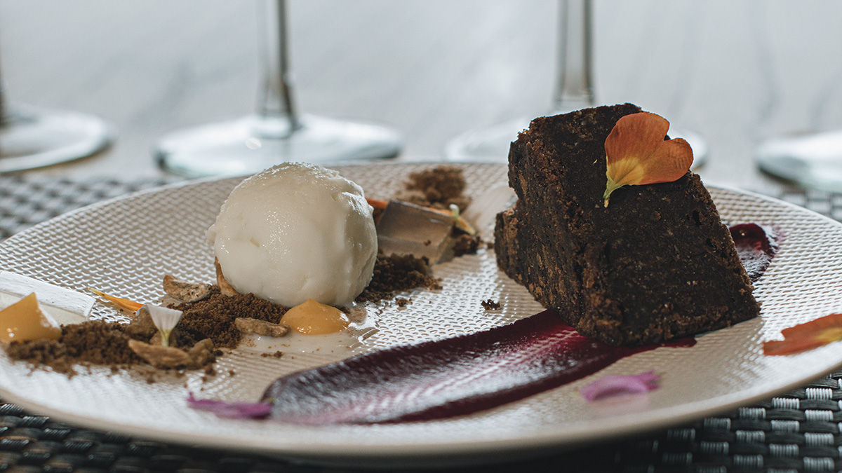 Y para quienes esperan lo dulce, se sirve un pre postre un sorbete de pera y chia con una copa de Decero Signature Malbec 2017, seguido del postre, un exquisito chocolate amargo con gel cítrico, helado de coco, gelatina de almendras y mermelada de remolacha con jengibre. Para este plato final se seleccionó un Decero Mini Ediciones Garnacha 2006.