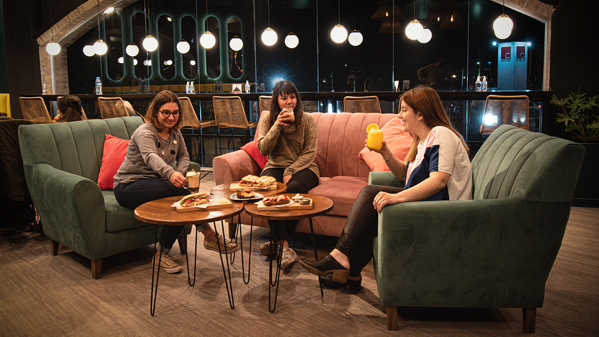 En este local de dos pisos podés acomodarte en sus barras con banquetas altas para hacer del lugar tu home office, o elegir sus sillones más íntimos para tener tus charlas extendidas. También hay sus mesas, ideales para reencontrarte con tus amigos.