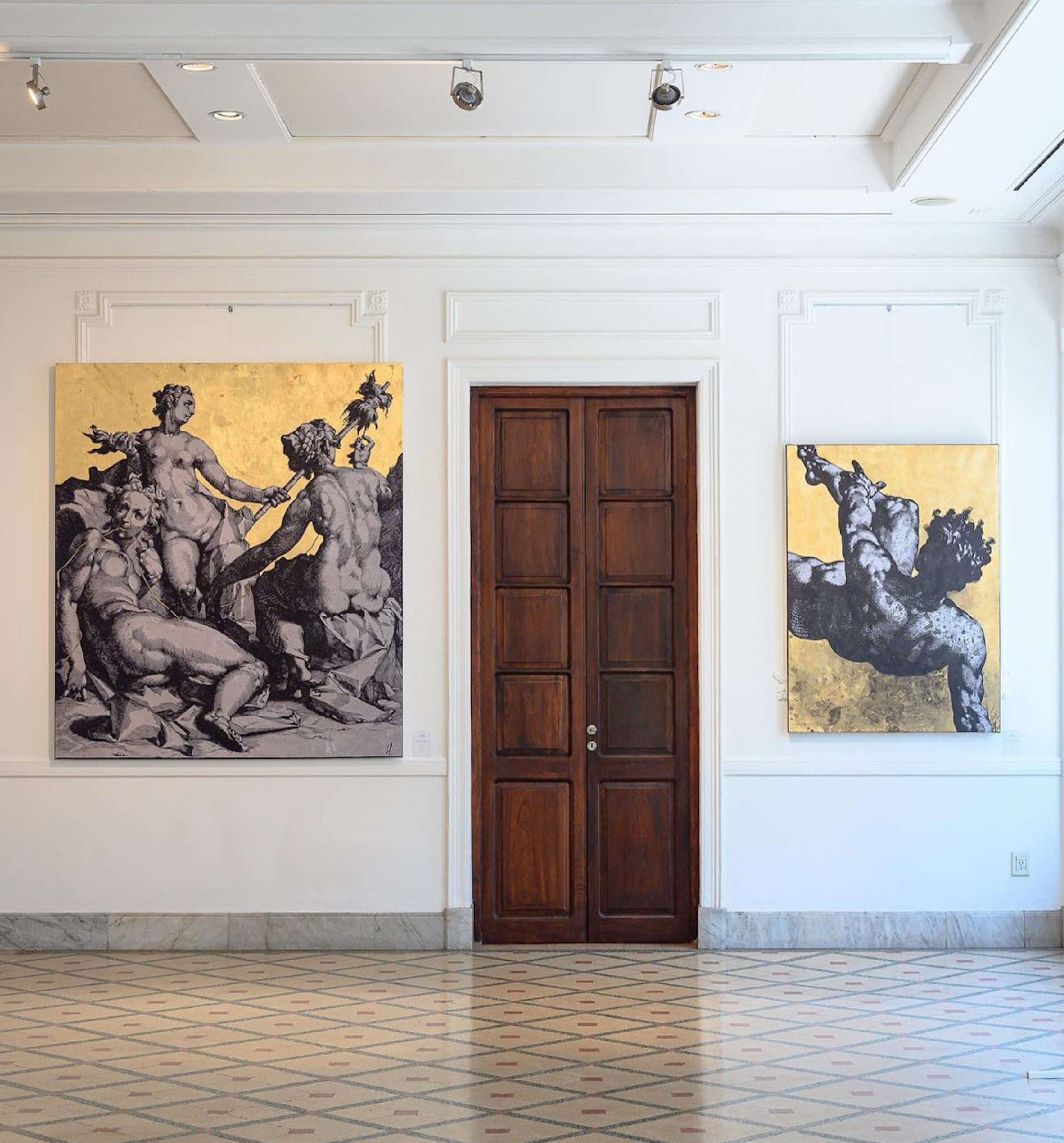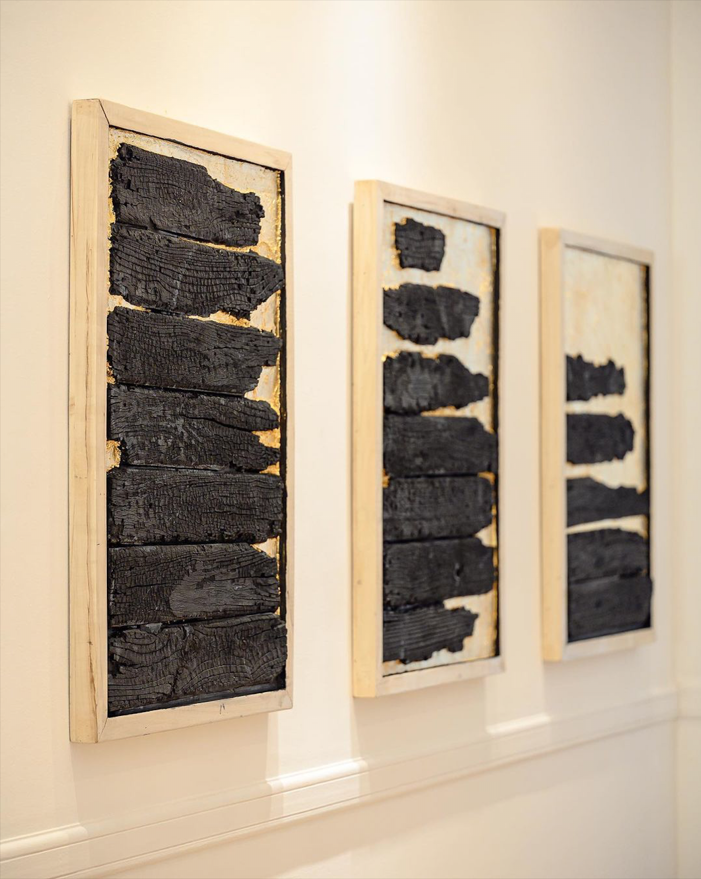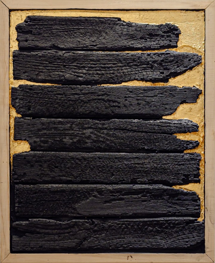 Para sus cuadros redujo al mínimo los materiales y los colores -igual que como quedó el lugar que habitaba-: «Solo usé negro y oro; tinta china, fibrones y cenizas de la casa trituradas para el primero y la técnica antigua de dorado a la hoja para el segundo».