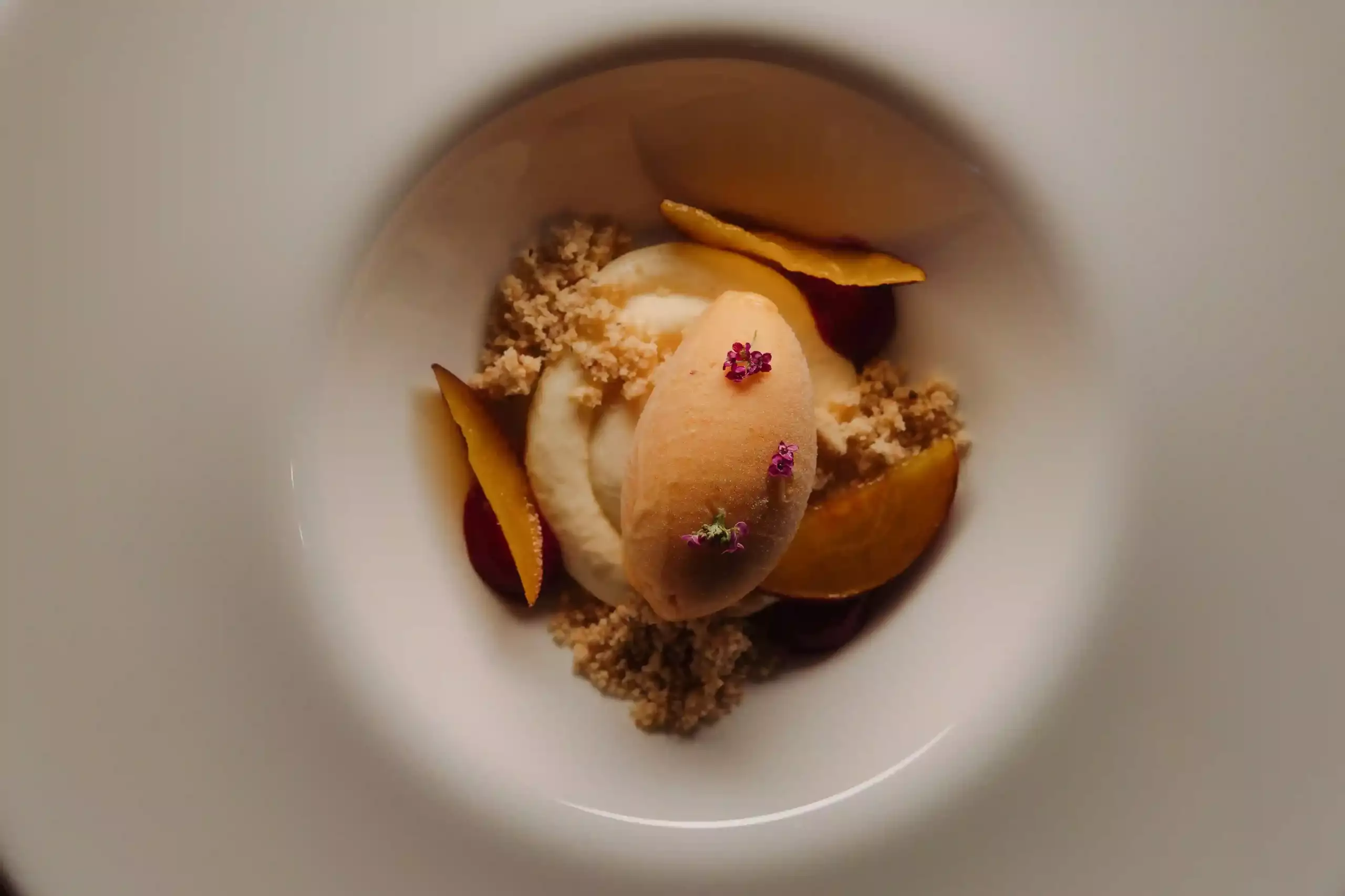 Zonda, Cocina de Paisaje, también en Bodega Lagarde, lleva ese juego un paso más allá. Su chef Augusto García trabaja helados que combinan técnica y audacia: lima, azafrán de Tunuyán, ajo negro, burro, lavanda con chocolate blanco, apio con manzana verde y limón, cacao amargo o papa. Hasta un helado de pan que está formulando para acompañar con sandía. Aquí, el helado no siempre es dulce ni ocupa el mismo lugar, a veces acompaña y otras contrasta.