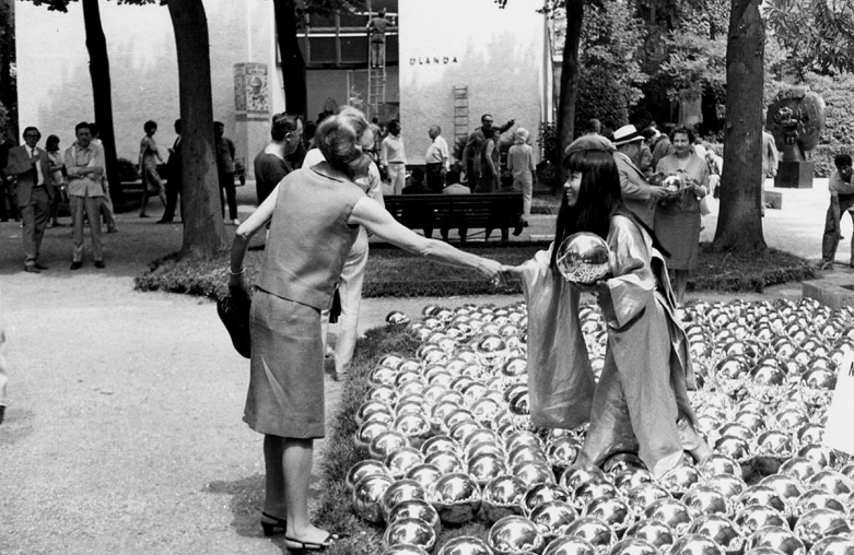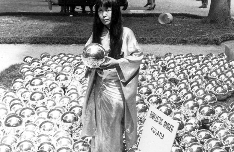 «El pintor, ceramista y escultor italo-argentino Lucio Fontana la salvó, sin proponérselo, de su estado depresivo: financió la producción de la obra con la que Kusama irrumpió en la Bienal de Venecia del año 1966. No tenía invitación, pero ella se apostó a la entrada de la exhibición con Narcissus Garden —una pieza conformada por 1.500 bolas de espejos—, a la vez que repartía volantes que rezaban: «A la venta tu narcisismo»; cada circunferencia costaba apenas dos dólares. Su trasgresión fue censurada por el cuerpo de vigilancia, pero se convirtió en la noticia que eclipsó a los artistas que estaban formalmente invitados», consigna Pedráñez.