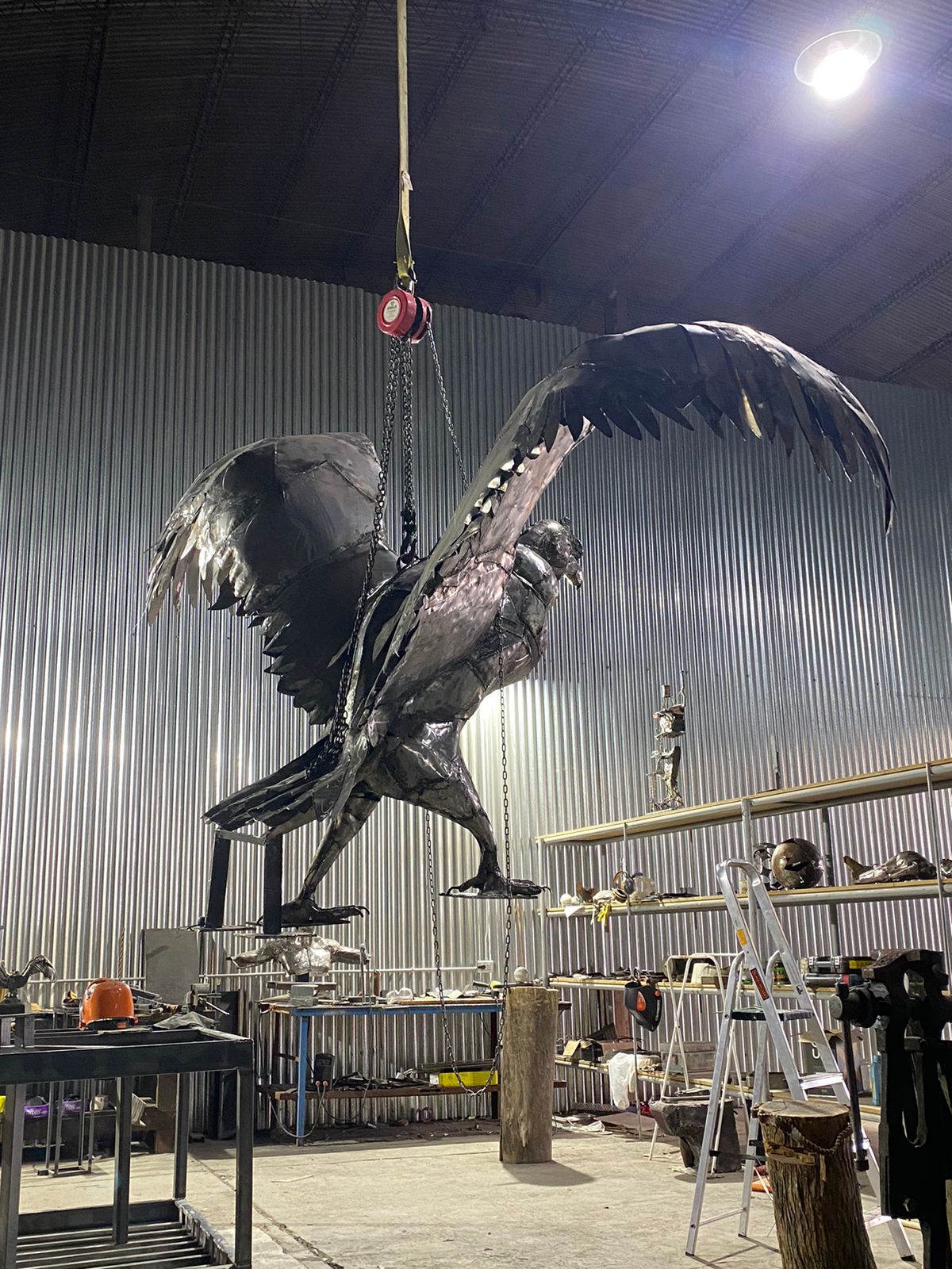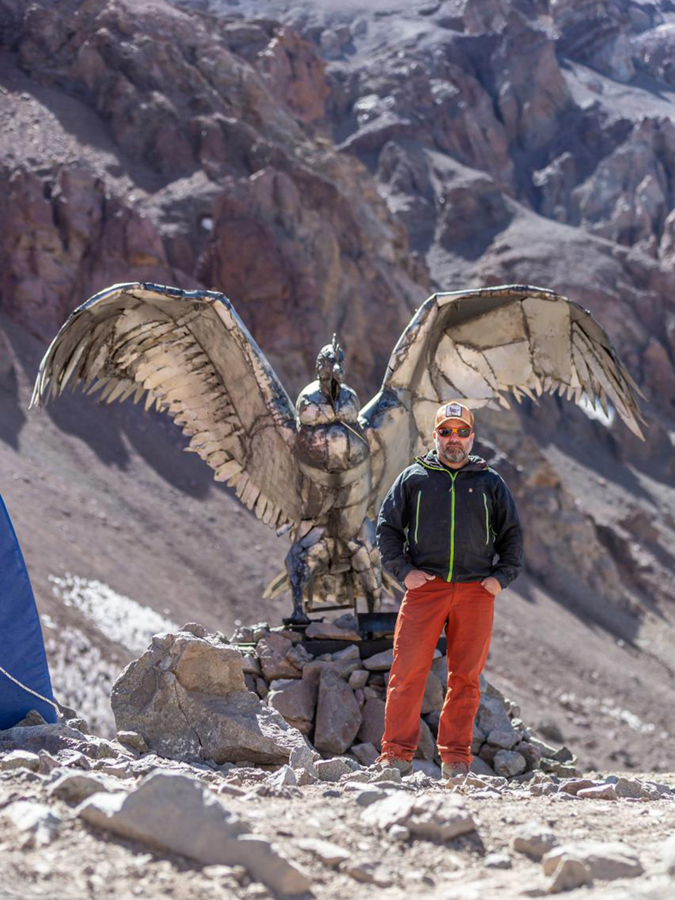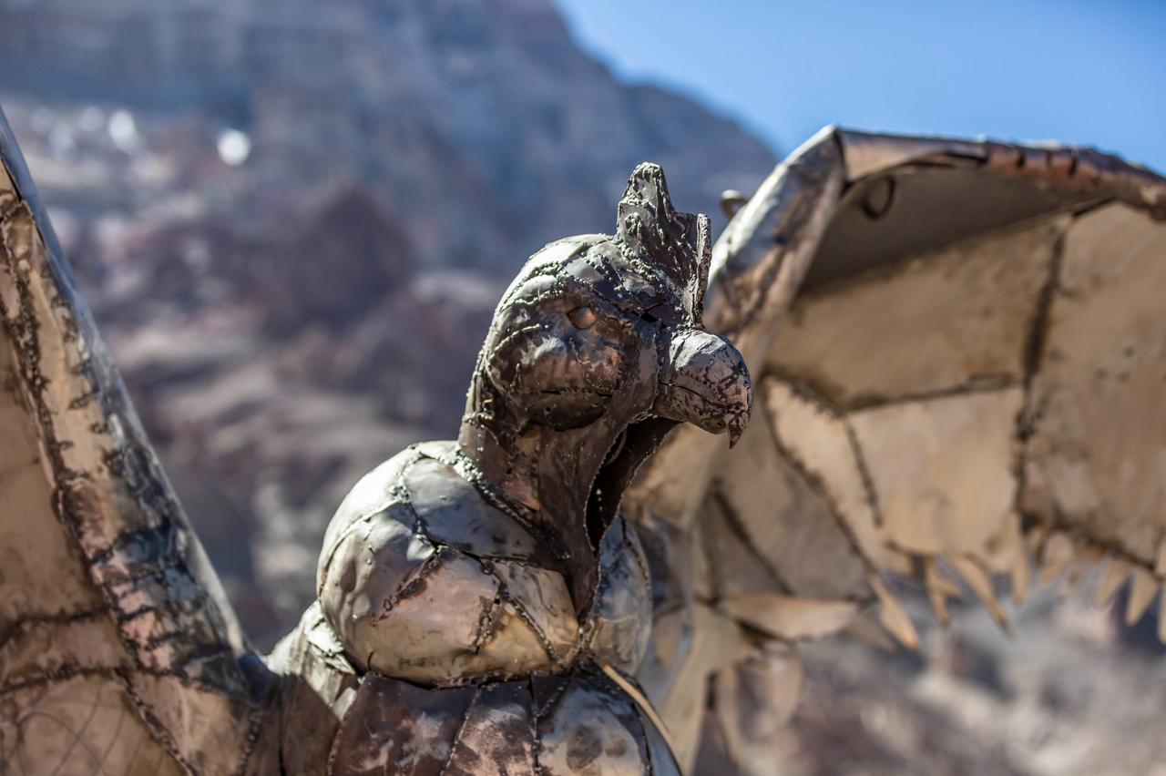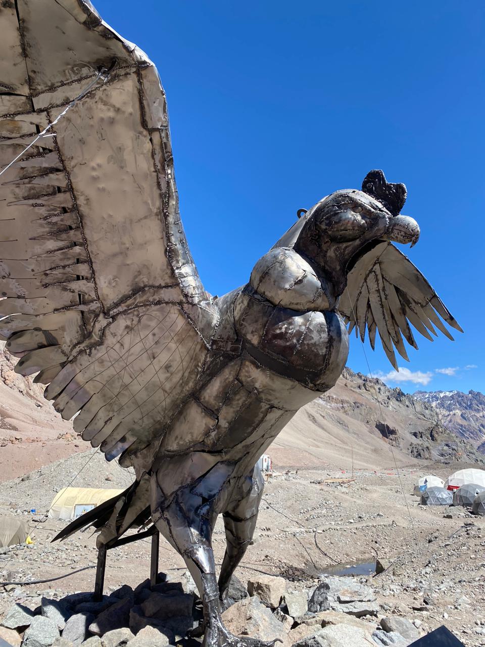 Así surgió este fantástico cóndor que ya reina en la base de las expediciones al cerro más alto del continente americano. La ejecución de la idea quedó en manos del escultor que después de meses de arduo trabajo le dio vida a la criatura que mide casi 4 metros con sus alas semi desplegadas y un 1.80 metros de altura. “Trabajo con chapa batida y en este caso usé chapas nuevas y otras recicladas. Quedó casi el doble de lo que es un cóndor normal”, revela Portnoy.