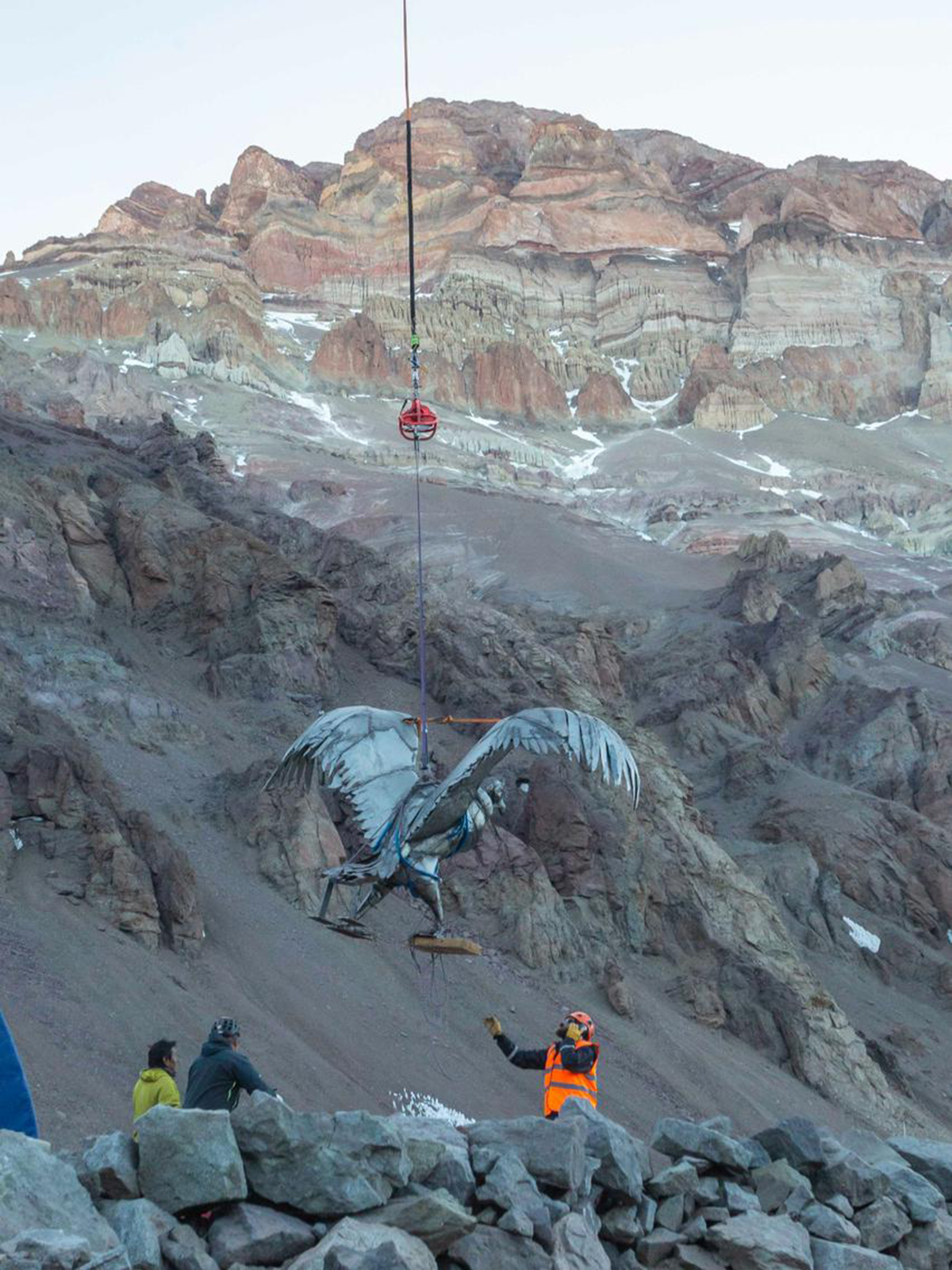 A principio de enero de este año se inauguró la obra. “Fue una odisea subirlo en el helicóptero. Primero subí la base, y estuve en Plaza de Mulas desde el 23 al 27 de diciembre armando el soporte y esperando que subieran el cóndor. Se hizo una donación de la obra al Parque Aconcagua y hubo que hacer el pertinente estudio de impacto ambiental”.