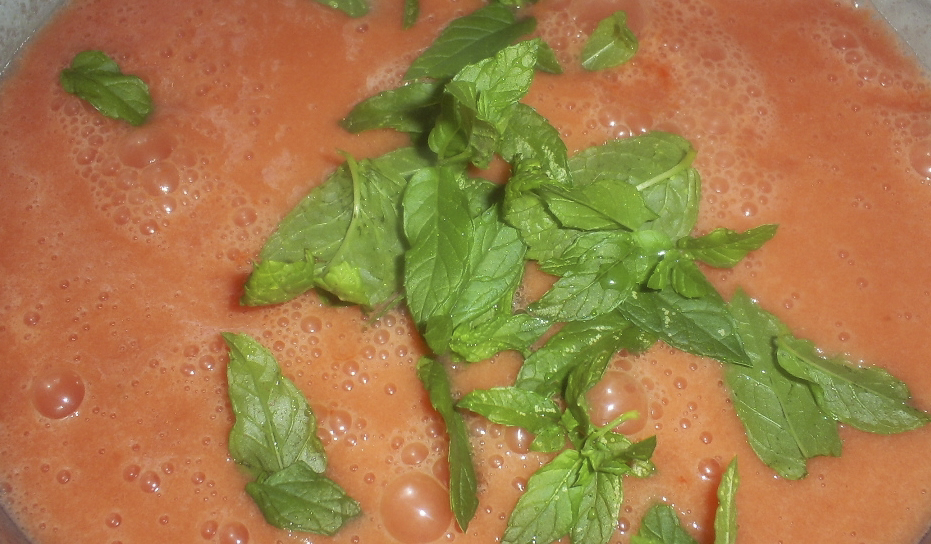 Tenés que licuar: Un cuarto de una sandía/3 tomates maduros/Una cebolla chica/Un chile (jalapeño o pimiento pequeño, está en todas las verdulerías)/ Una cucharada de curry/ Aceite y vinagre (una taza de café de cada uno/Cien gramos de queso azul/ Una cucharada de miel/ Pimienta, y sal.