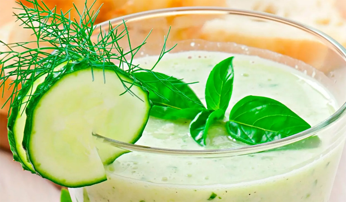 Licuar: 2 pepinos grandes (o 3 medianos)/ Una papa previamente hervida y sin agua/ Un yogur natural sin azúcar/ Una cebolla/ Un limón/ Un manojo de menta/ Dos cucharadas de aceite de oliva/ Sal y pimienta.